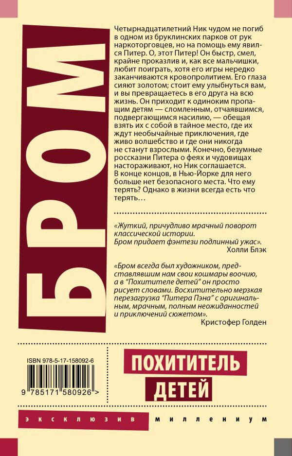 Джеральд Бром создает потрясающий мир, который оживает на страницах «Похитителя детей». Он переворачивает сказку Питера Пэна с ног на голову, представляя нам более темную и сложную версию изначально невинного мира Дж. М. Барри.