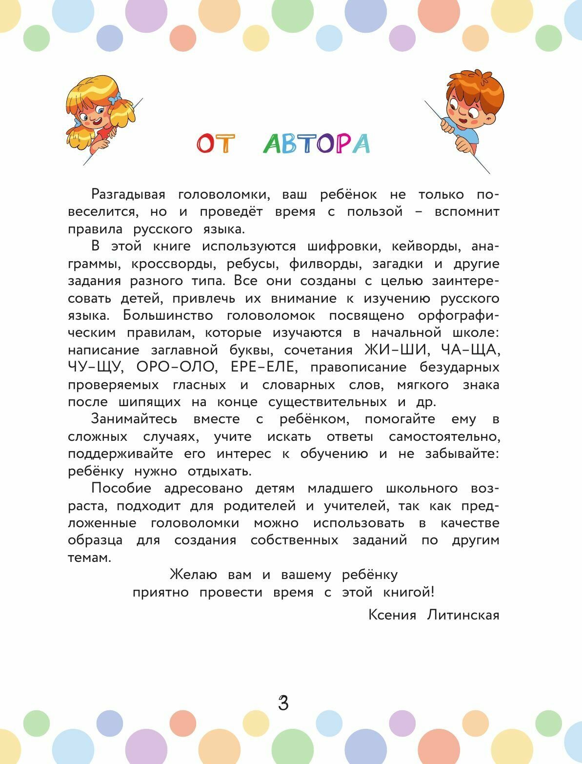 В этой книге вы найдете кейворды, ребусы, загадки и другие виды заданий, которые помогут ребенку освежить и закрепить знания в области русской орфографии. Увлекательные упражнения охватывают основные темы, которые проходят в начальной школе. Это сочетания ЖИ—ШИ, ЧА—ЩА, суффиксы существительных, безударные гласные и другие орфограммы.