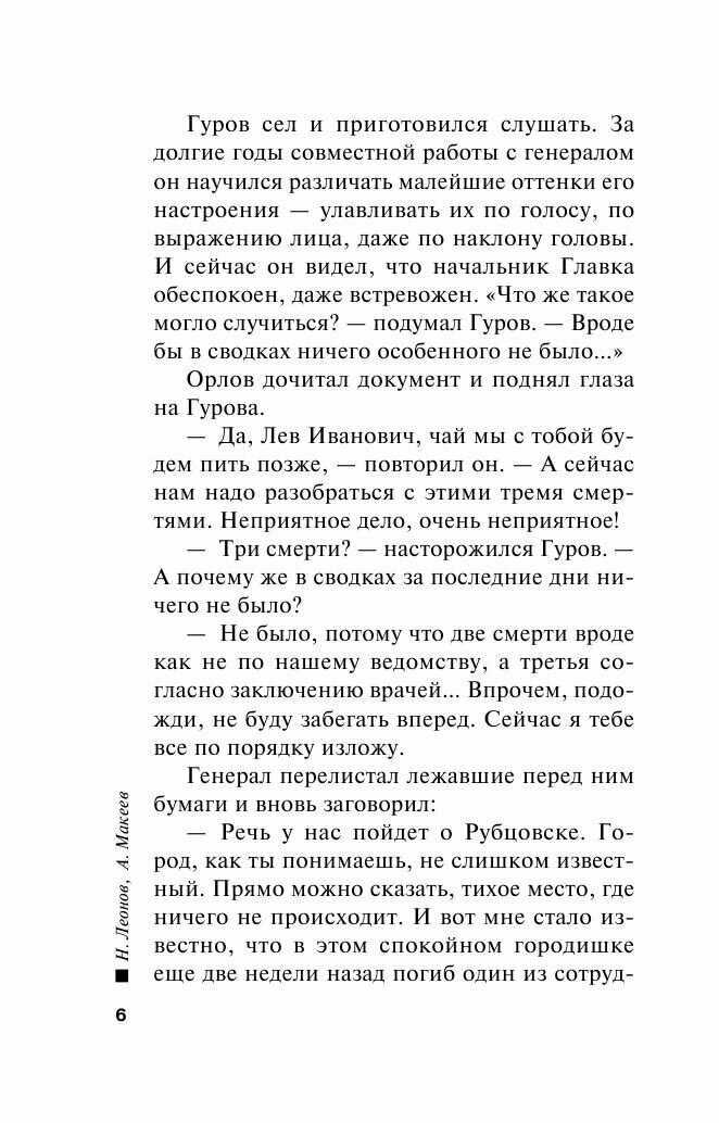 Николай Леонов, в прошлом следователь МУРа, не понаслышке знал, как раскрываются самые запутанные уголовные дела. Поэтому каждая его книга — это правдивая захватывающая история с непредсказуемой интригой и неожиданным финалом. Главный герой этих книг, полковник Лев Гуров — сыщик высокого класса, к тому же с массой положительных человеческих качеств. Его уважают друзья, боятся враги и любят женщины. Он — настоящий отечественный супермен. Романы о Льве Гурове вот уже сорок лет неизменно привлекают поклонников отечественного детектива. Ставшая классической серия «Черная кошка» насчитывает более 200 книг, вышедших тиражом в десятки миллионов экземпляров.
