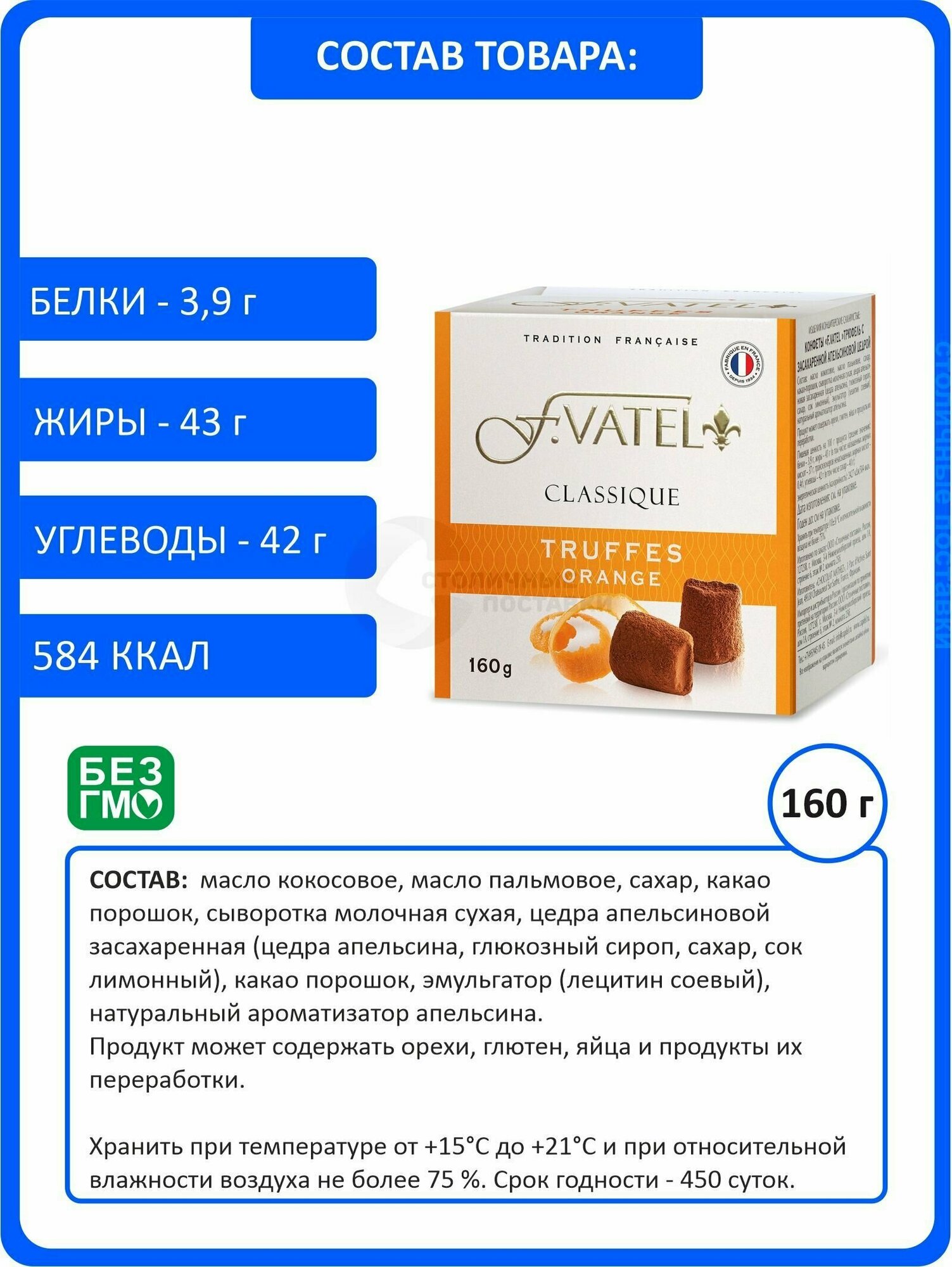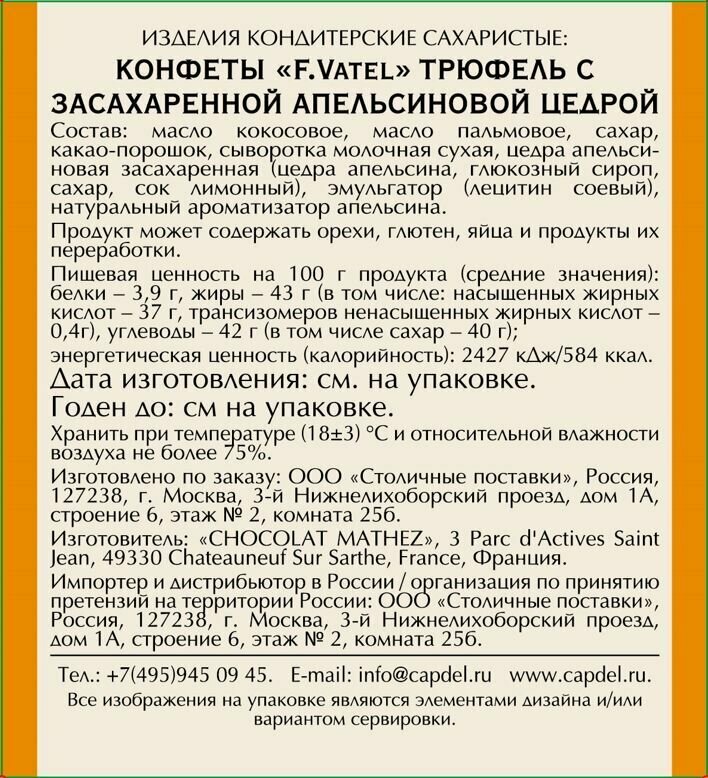 Сервис сравнения цен СкидкаГИД предлагает сравнить цены на товар «Конфеты F. Vatel Трюфель с засахаренной апельсиновой цедрой 160г Chocolat Mathez»