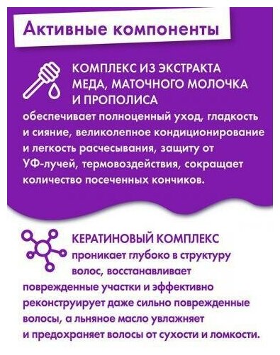| Химический состав | Aqua, Cetearyl Alcohol, Propylene Glycol, Bis-Hydroxy/Methoxy Amodimethicone, Cetrimonium Chloride, Glycerin, Glyceryl Stearate, PEG-100 Stearate, Olea Europaea Fruit Oil, Ceteareth-23, Silicone Quaternium-18, Trideceth-6, Trideceth-12, Parfum, Hydroxyethylсellulose, Hydrolyzed Keratin, Linum Usitassimum Seed Oil, Mel Extract, Royal Jelly Extract, Propolis Extract, Benzophenone-4, Disodium EDTA, Brassica Napus Seed Oil, Glyceryl Palmitate/Stearate, BHA, BHT, Propyl Gallate, Citric Acid, Sodium Acetate, Isopropyl Alcohol, Cellulose, Methylchlоroisothiazolinone, Мethylisothiazolinone, Sodium Benzoate, Potassium Sorbate., |