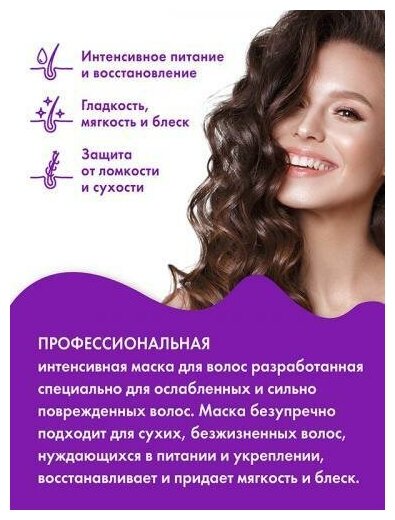 Профессиональная интенсивная маска для волос разработанная специально для ослабленных и сильно поврежденных волос. Маска безупречно подходит для сухих, безжизненных волос, нуждающихся в питании и укреплении, восстанавливает и придает мягкость и блеск. Формула маски обогащена комплексом из экстракта меда, маточного молочка и прополиса, который обеспечивает полноценный уход, гладкость и сияние, великолепное кондиционирование и легкость расчесывания, защиту от УФ-лучей, термовоздействия, сокращает количество посеченных кончиков. Кератиновый комплекс проникает глубоко в структуру волос, восстанавливает поврежденные участки и эффективно реконструирует даже сильно поврежденные волосы, а льняное масло увлажняет и предохраняет волосы от сухости и ломкости. Маска обеспечит роскошный уход и интенсивное восстановление.