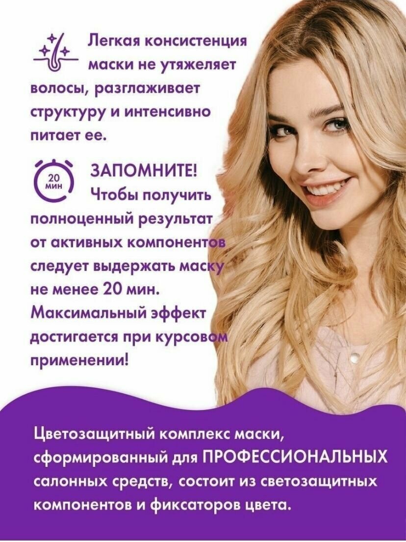 Цветозащитный комплекс маски, сформированный для профессиональных салонных средств, состоит из светозащитных компонентов и фиксаторов цвета. Комплекс создан на основе природных компонентов, которые работают на оздоровление и сохранение целостности структуры и цвета волос, восстанавливая и укрепляя связи с кератиновыми волокнами.
