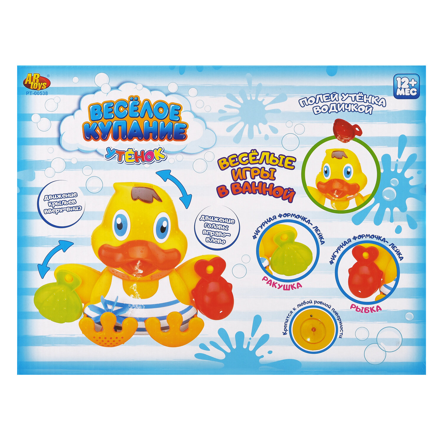 Этот симпатичный, яркий утенок-мельница для ванны "Веселое купание" сделает купание малыша интересным и увлекательным, Функции: - голова утенка двигается в стороны, крылья двигаются вверх-вниз - фигурная формочка -лейка - развивает визуальный и творческий навык, а также навыки координации. Комплектация: - утенок-мельница, - формочки (ракушка, рыбка) 2 шт. Дополнительно: Для детей от 1-го года. Вес: 500 гр. Размер упаковки (д/ш/в): 31,8x24,3x9,6 см. Для работы батарейки не требуются.