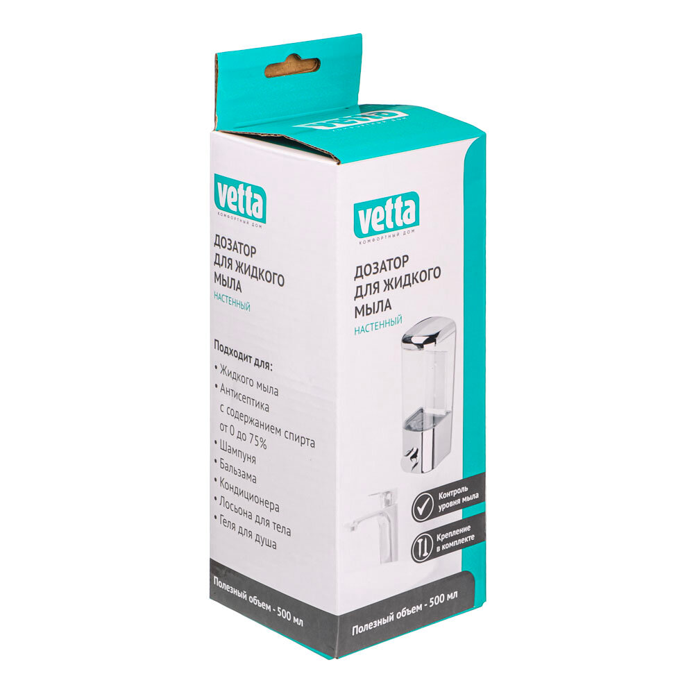Дозатор для жидкого мыла Vetta отличается стильным дизайном в сочетании с высоким уровнем практичности, функциональности и надёжности. Устанавливается на стену посредством саморезов. Хромированное покрытие корпуса позволяет органично вписываться в современные интерьеры ванных комнат. Объём резервуара составляет 500 мл.