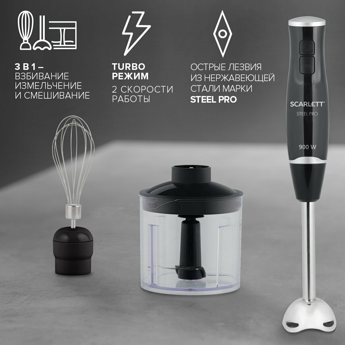 Scarlett SC-HB42F08 современный погружной блендер 3в1 предназначен для измельчения, взбивания и смешивания продуктов. Погружная часть блендера изготовлена из нержавеющей стали марки Steel Pro, которая отлично подходит для приготовления блюд любой температуры. Блендер станет незаменимым помощником на кухне, ведь он имеет 2 скоростных режима, включая турбо режим, что позволит справиться с кулинарными задачами любой сложности.