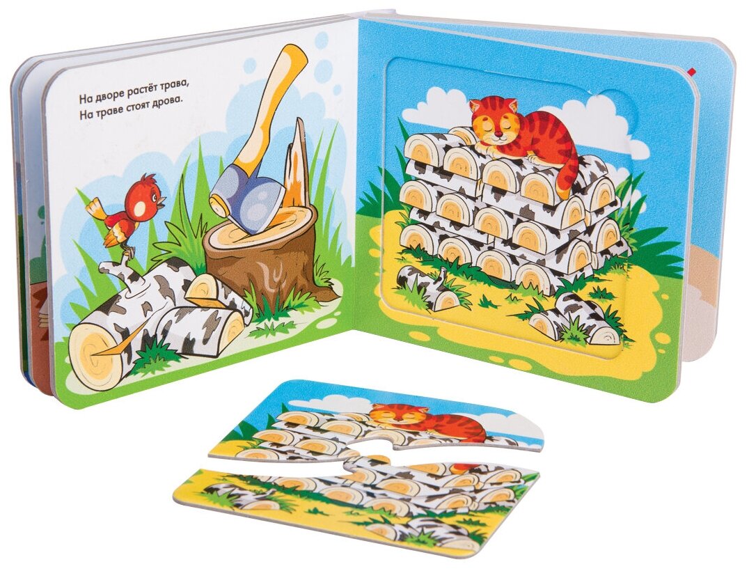 Книжка состоит из 8 страниц (4 разворота). Последняя страница – пазл-ступенька (состоит из 4 пазлов, которые расположены на странице друг за другом от большего к меньшему).