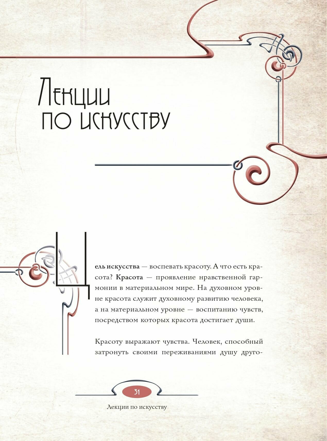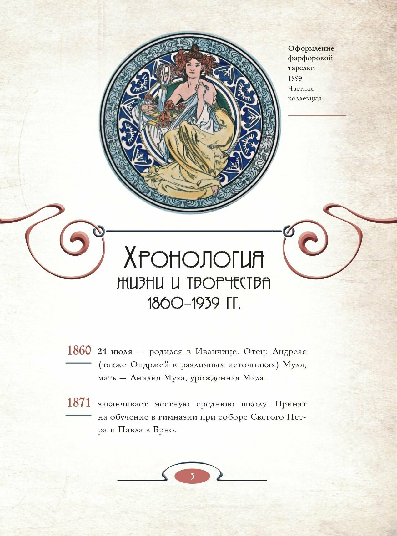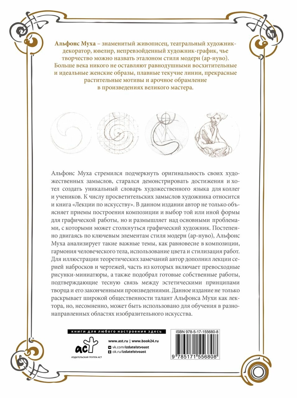 Альфонс Муха стремился подчеркнуть оригинальность своих художественных замыслов, старался демонстрировать достижения и хотел создать уникальный словарь художественного языка для коллег и учеников. К числу просветительских замыслов художника относится и книга «Лекции по искусству». В данном издании автор не только объясняет приемы построения композиции и выбор той или иной формы для графической работы, но и размышляет над основными проблемами, с которыми может столкнуться графический художник. Постепенно двигаясь по ключевым элементам стиля модерн (ар-нуво), Альфонс Муха анализирует такие важные темы, как равновесие в композиции, гармония человеческого тела, использование цвета и стилизация работ. Для иллюстрации теоретических замечаний автор дополнил лекции серией набросков и чертежей, часть из которых включает превосходные рисунки-миниатюры, а также подобрал готовые собственные работы, подтверждающие тесную связь между эстетическими принципами творца и его законченными произведениями. Данное издание не только раскрывает широкой общественности талант Альфонса Мухи как лектора, но, несомненно, может быть использовано для обучения в разнонаправленных областях изобразительного искусства.