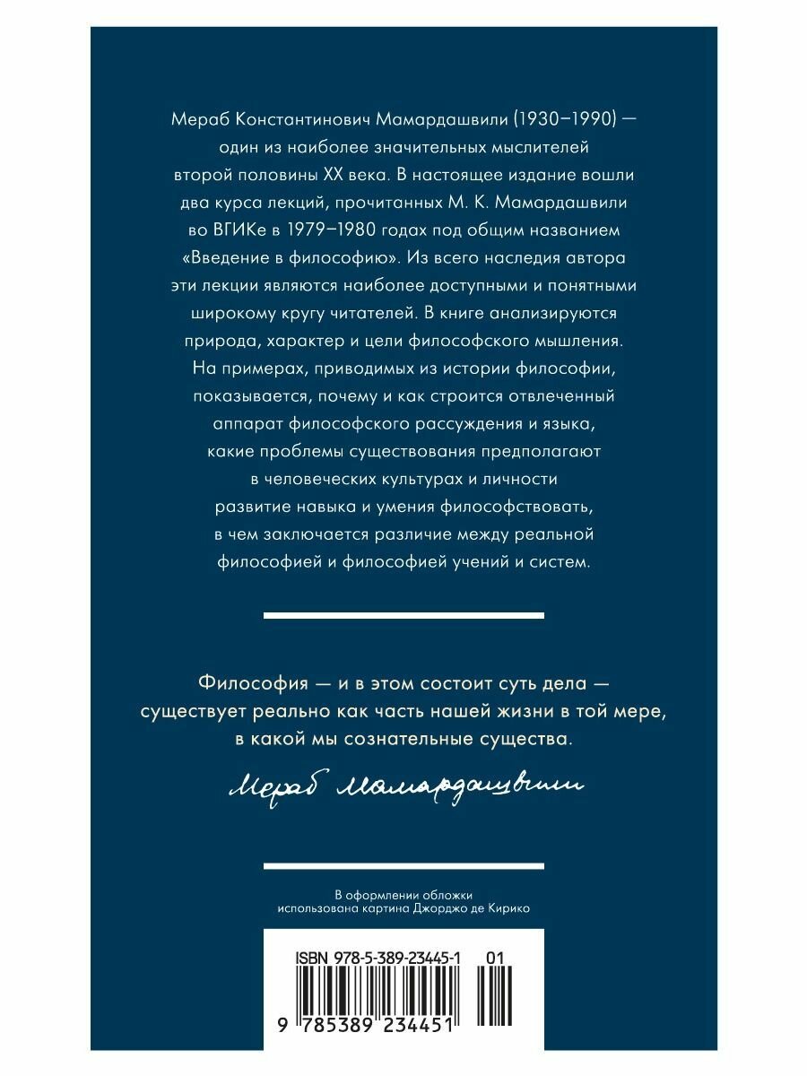 Мераб Константинович Мамардашвили (1930–1990) — один из наиболее значительных мыслителей второй половины ХХ века. В настоящее издание вошли два курса лекций, прочитанных М. К. Мамардашвили во ВГИКе в 1979–1980 годах под общим названием «Введение в философию». Из всего наследия автора эти лекции являются наиболее доступными и понятными широкому кругу читателей. В книге анализируются природа, характер и цели философского мышления. На примерах, приводимых из истории философии, показывается, почему и как строится отвлеченный аппарат философского рассуждения и языка, какие проблемы существования предполагают в человеческих культурах и личности развитие навыка и умения философствовать, в чем заключается различие между реальной философией и философией учений и систем.