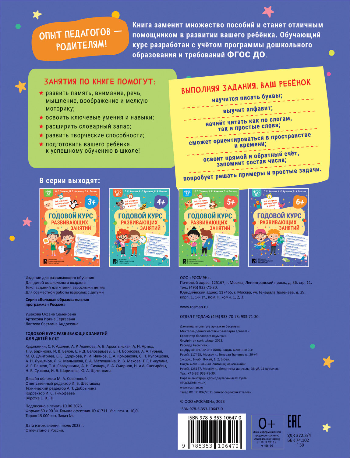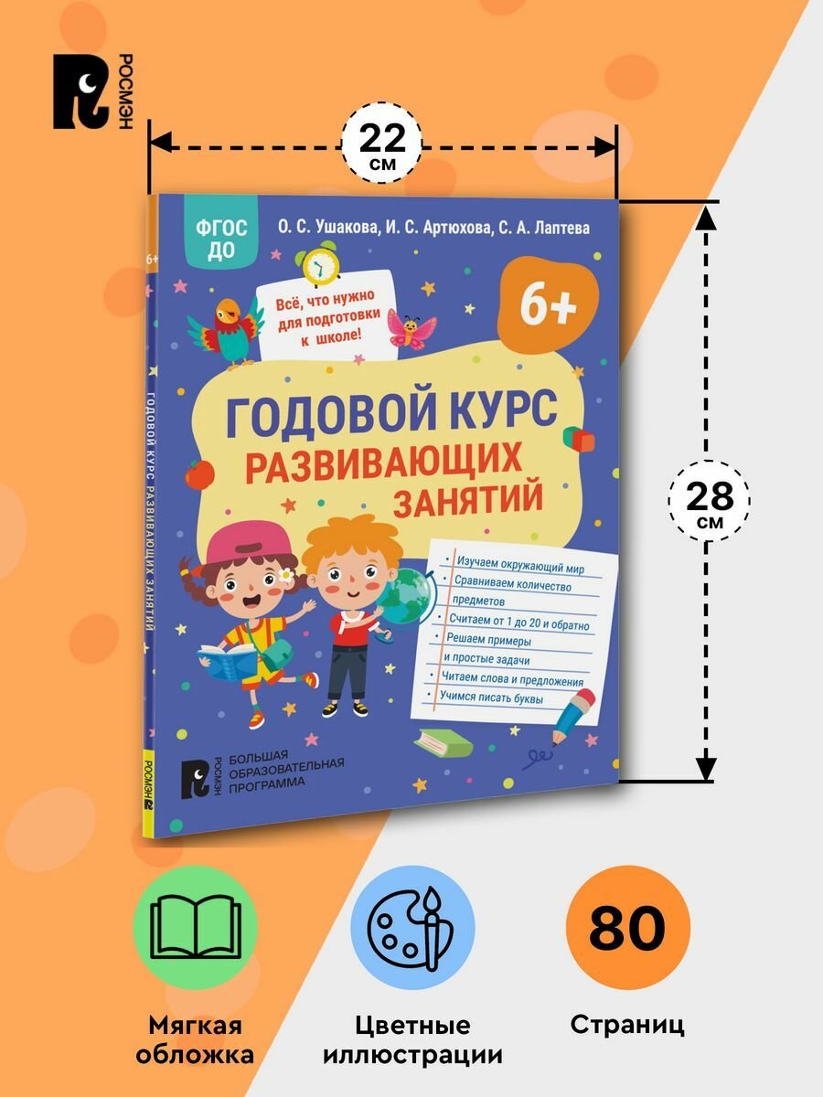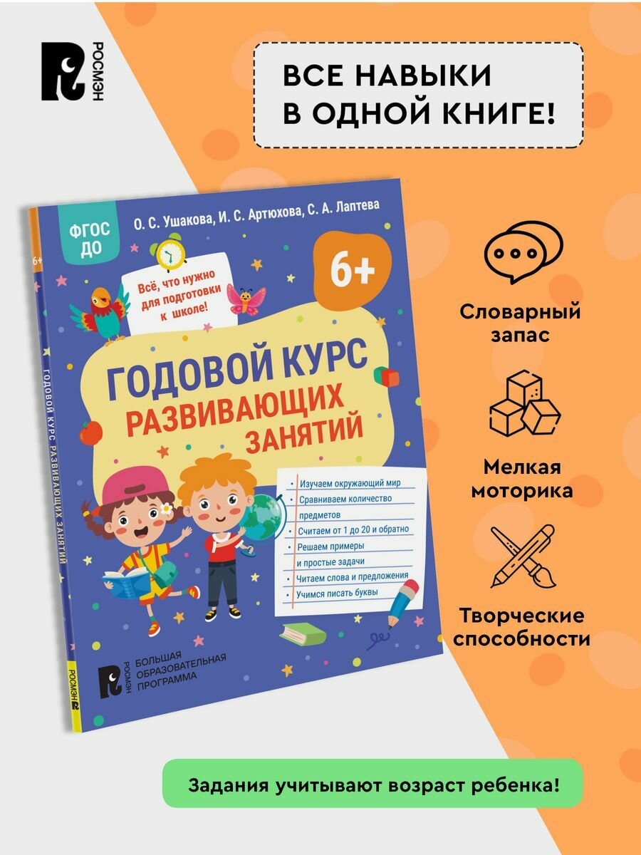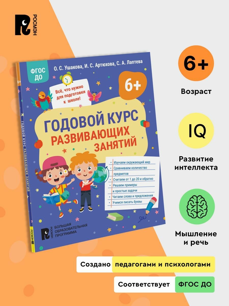 Годовой курс развивающих занятий для детей 6 лет (Артюхова Ирина Сергеевна, Лаптева Светлана Андреевна, Ушакова Оксана Семеновна); РОСМЭН, 2023
