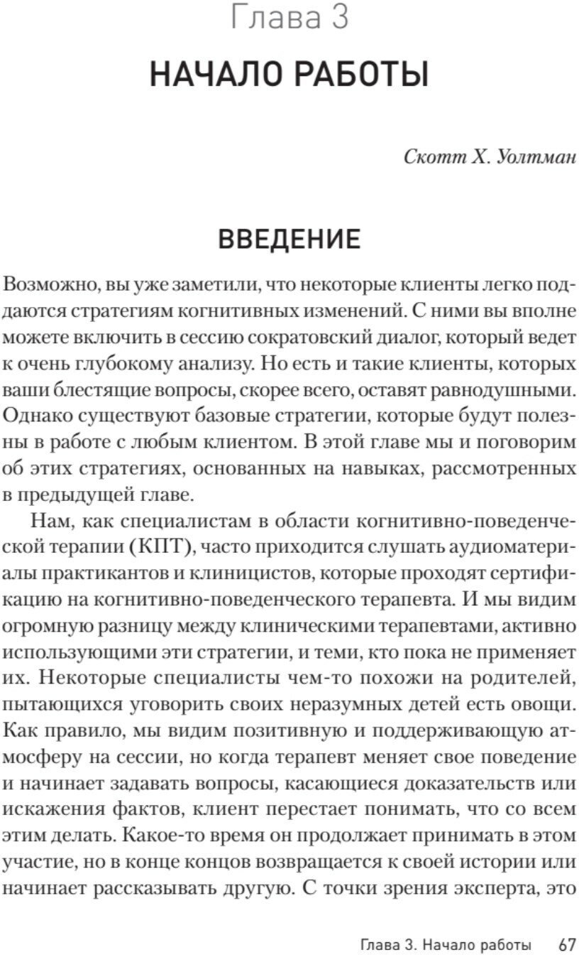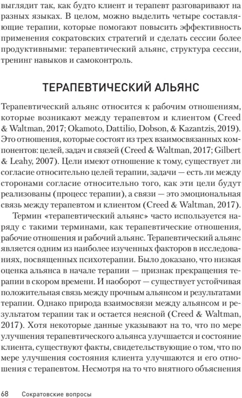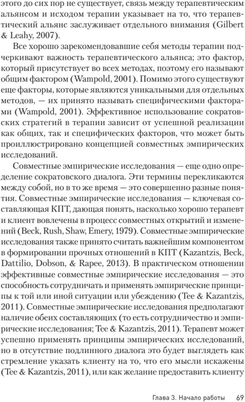 Эта книга собрала в себе экскурс по всем методам когнитивно-поведенческой терапии, направленной на изменение негативного мышления через рефлексию. Сюда входят элементы эмоционально-фокусированной терапии, терапии принятия и ответственности, диалектической поведенческой терапии, функционально аналитической психотерапии, схема-терапии, а так же экзистенциальной и гуманистической психотерапевтических традиций. Речь пойдет об изменении базовых, укоренившихся иррациональных убеждений, что в итоге приведет человека к облегчению состояния и поспособствует позитивным изменениям в поведении, мышлении и эмоциональном реагировании. Сократовский метод не надо воспринимать в прямом значении, Сократ вряд ли смог бы практиковать современную терапию. Сократовский диалог, описанный в этой книге, соответствует доказательной базе эффективной терапии, и, как отмечает автор, приводит к глубоким и долговременным когнитивным изменениям. Он строится не на споре с пациентом, а на диалоге с ним, даже если, на первый взгляд, он идет ни о чем. Сократовские вопросы — это метод ведения диалога, при котором вместо того, чтобы приводить аргумент, психотерапевт помогает собеседнику самому прийти к этому аргументу. Все описано по порядку и, должна сказать, очень простым языком, не смотря на всю сложность темы. Этот материал, эта книга, была создана, в первую очередь, для коллег, начинающих и практикующих. Автор в своей книге обучает сократовскому диалогу, вместе с этим рассказывает и общие базовые вещи в практике психотерапии. В книге, как обычно, много реальных примеров из практики. Автор выделил отдельную главу, чтобы рассказать об использовании сократовского метода на людях с расстройством личности, а именно ПРЛ. Что интересно, вы так же найдете главу "сократовские стратегии для обучения сократовским стратегиям". И важный момент для людей, не занимающихся профессиональной психологией, а любителям самотерапии, глава - "Сократовский метод для самого себя". Так как книга, повторюсь, читается достаточно легко и очень интересно, я бы не стала сужать аудиторию только до профессионалов, но так же советовала бы ее как пособие по самотерапии. -