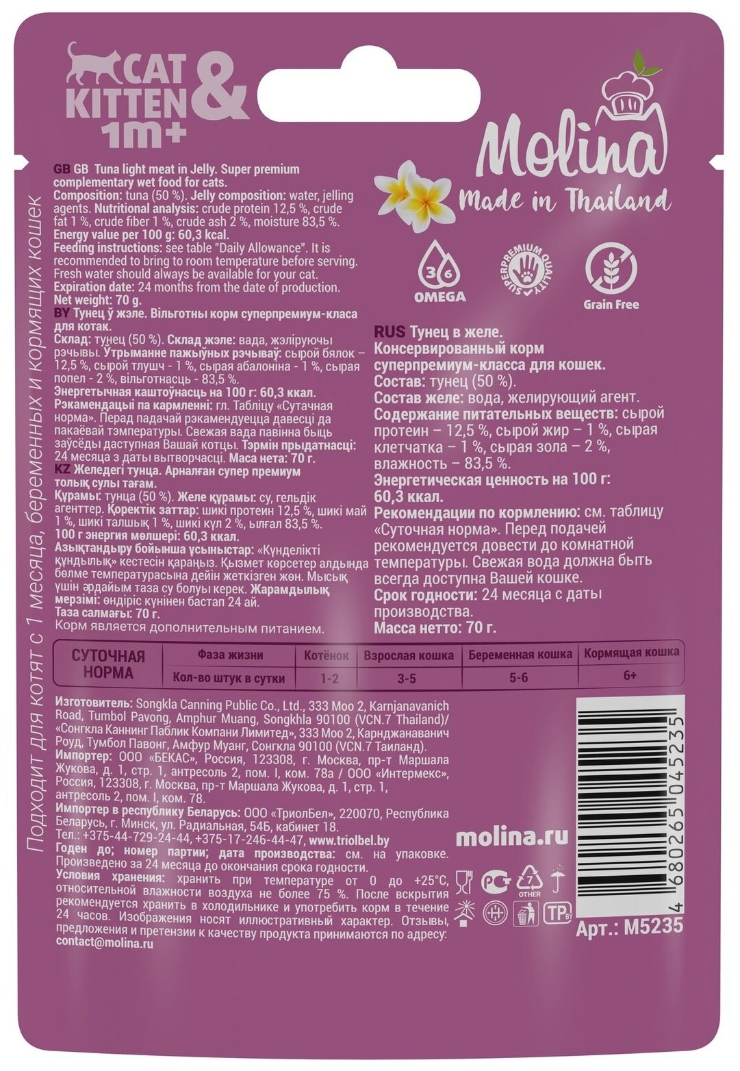 Влажный корм для для котят и кошек Molina Тунец в желе 70г Songkla Canning Public Co