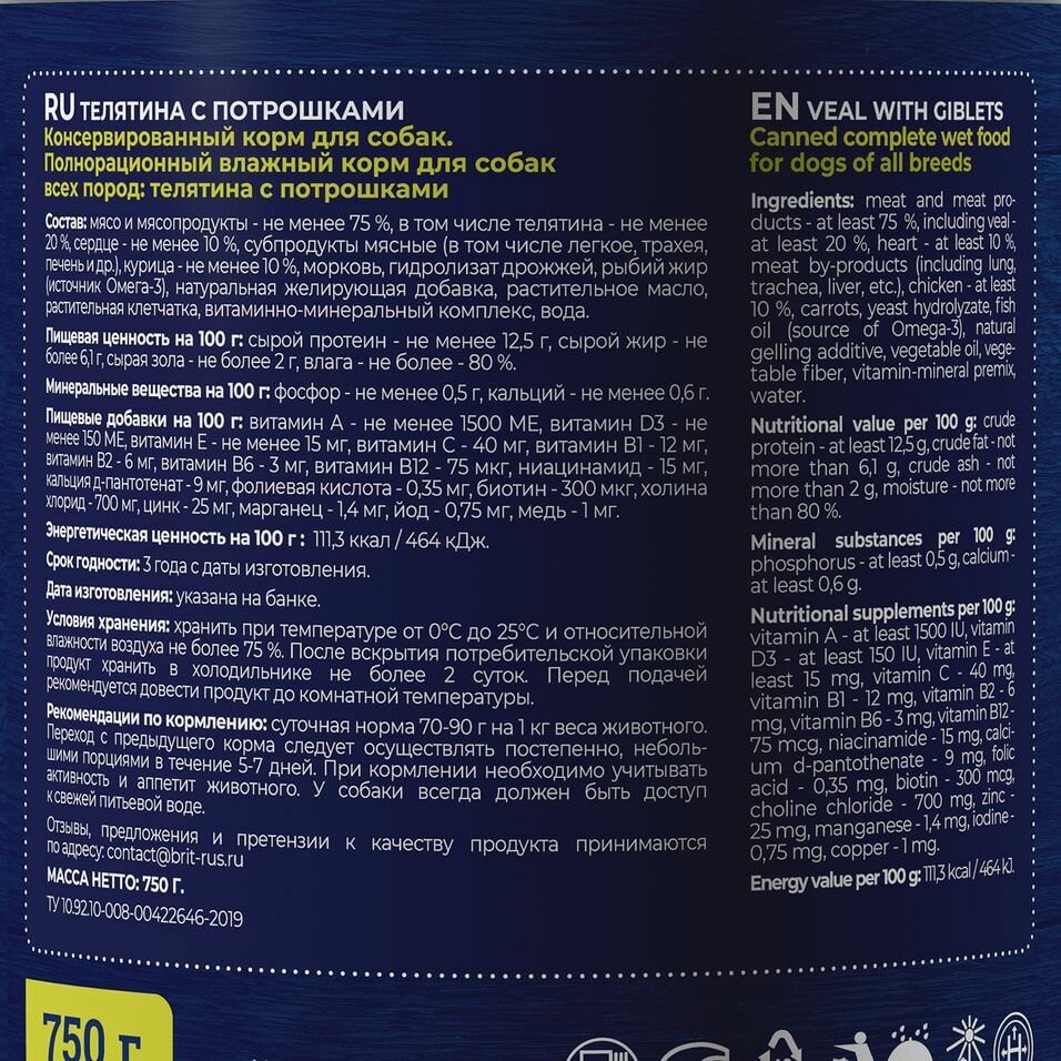 Корм консервированный для собак Brit телятина с потрошками 750 г