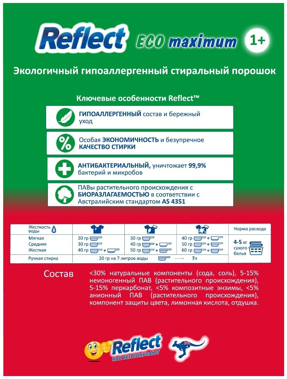 Экологичный гипоаллергенный стиральный порошок Reflect Eco Maximum Универсальный концентрированный стиральный порошок для ручной и машинной стирки белья. Ключевые особенности Reflect 1. Гипоаллергенный состав и бережный уход 2. Особая экономичность и безупречное качество стирки 3. Антибактерильный, уничтожает 99,9% бактерий и микробов 4. ПАВы растительного происхождения с биоразлагаемостью в соответствии с Австралийским стандартом AS 4351 Специальная формула предназначена для стирки цветных и светлых вещей, поддерживает и обновляет цвет, сохраняя структуру ткани. Эффективно удаляет различные пятна и неприятные запахи. Подходит для всех видов тканей и для стирки детского белья от 1 года, включая синтетические и с мембранным покрытием, типа GORE-TEX. Безопасен для септиков и систем очистки воды. Предотвращает образование накипи на водонагревательном элементе.