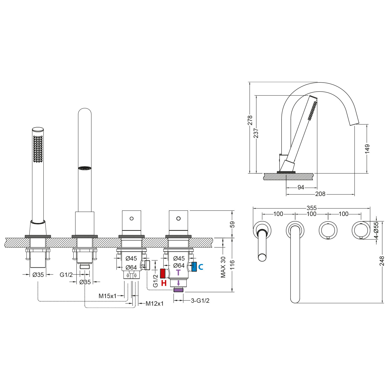 Тип смесителя Для ванной, Врезной, С термостатом Коллекция Saona Управление Однорычажное Цвет Золото матовое Поверхность Матовая Материал Латунь класса А Тип излива Неповоротный Диаметр керамического картриджа 35 мм Официальная гарантия 60 месяцев (5 лет). Цвет матовое золото никогда не выйдет из моды, во все времена драгоценный металл был признаком богатства. Смеситель Timo Saona 2330 предназначен для установки на борт ванны. Врезной смеситель придаст ванной комнате оригинальности, благодаря тому, что шланг ручной лейки и все соединения скрыты. Использовать такой смеситель очень удобно, термостатический картридж поддерживает стабильную температуру воды, обеспечивая максимально комфортные условия для принятия водных процедур. Переключение режимов потока воды и регулировка напора осуществляется плавным поворотом керамического дивертора. Поскольку часть конструкции является скрытой, рекомендуем позаботиться о том, чтобы к ней был доступ. Сложностей монтажа не возникает при установке смесителя опытным сантехником. Внимательно изучите инструкцию по монтажу и эксплуатации. Комплектация: Блок с термостатический картриджем-1 шт. Блок управления режимами (дивертор)-1 шт. Излив (латунный)-1 шт. Лейка ручного душа (латунная)-1 шт. Держатель ручного душа-1 шт. Шланг душа 1,5 м (латунный)-1 шт. Резиновые шайбы-8 шт. Металлические шайбы-4 шт. Гайки с фиксирующими винтами-4 шт. Ручка термостата-1 шт. Ручка дивертора-1 шт. Декоративные гайки-2 шт. Соединительные шланги (комплект) Инструкция-1 шт.