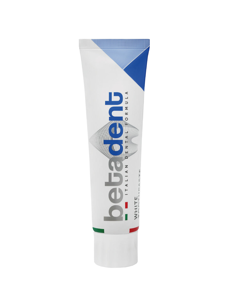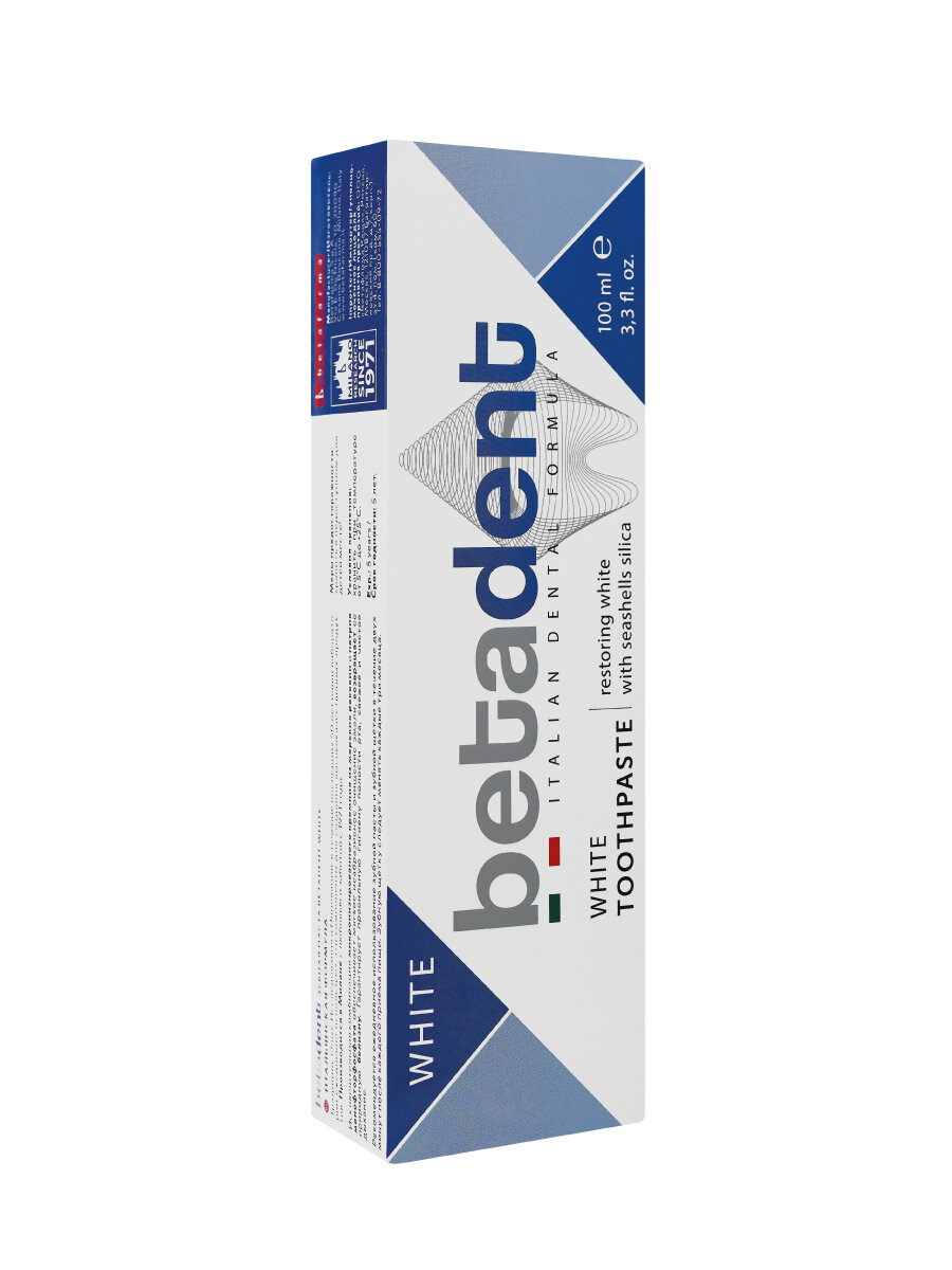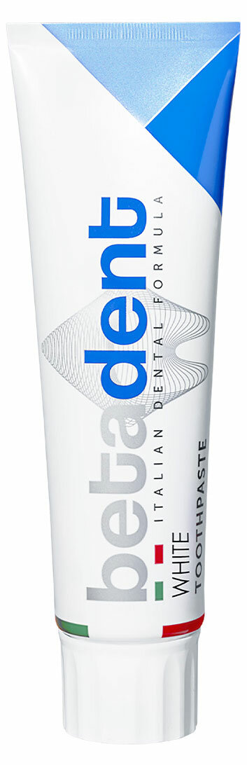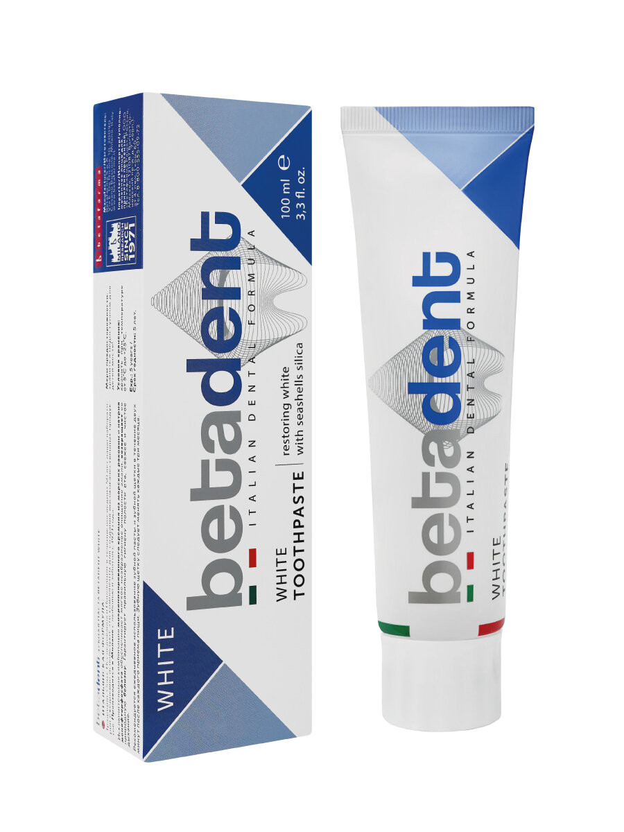 Отбеливающая зубная паста BETADENT ваш рецепт белоснежной улыбки: комбинация микрочастицы из морских раковин и монофторфосфата натрия. Она дает мягкое очищение от налета, пигментации, придает жемчужное сияние и блеск, а также реминерализует эмаль зубов.
