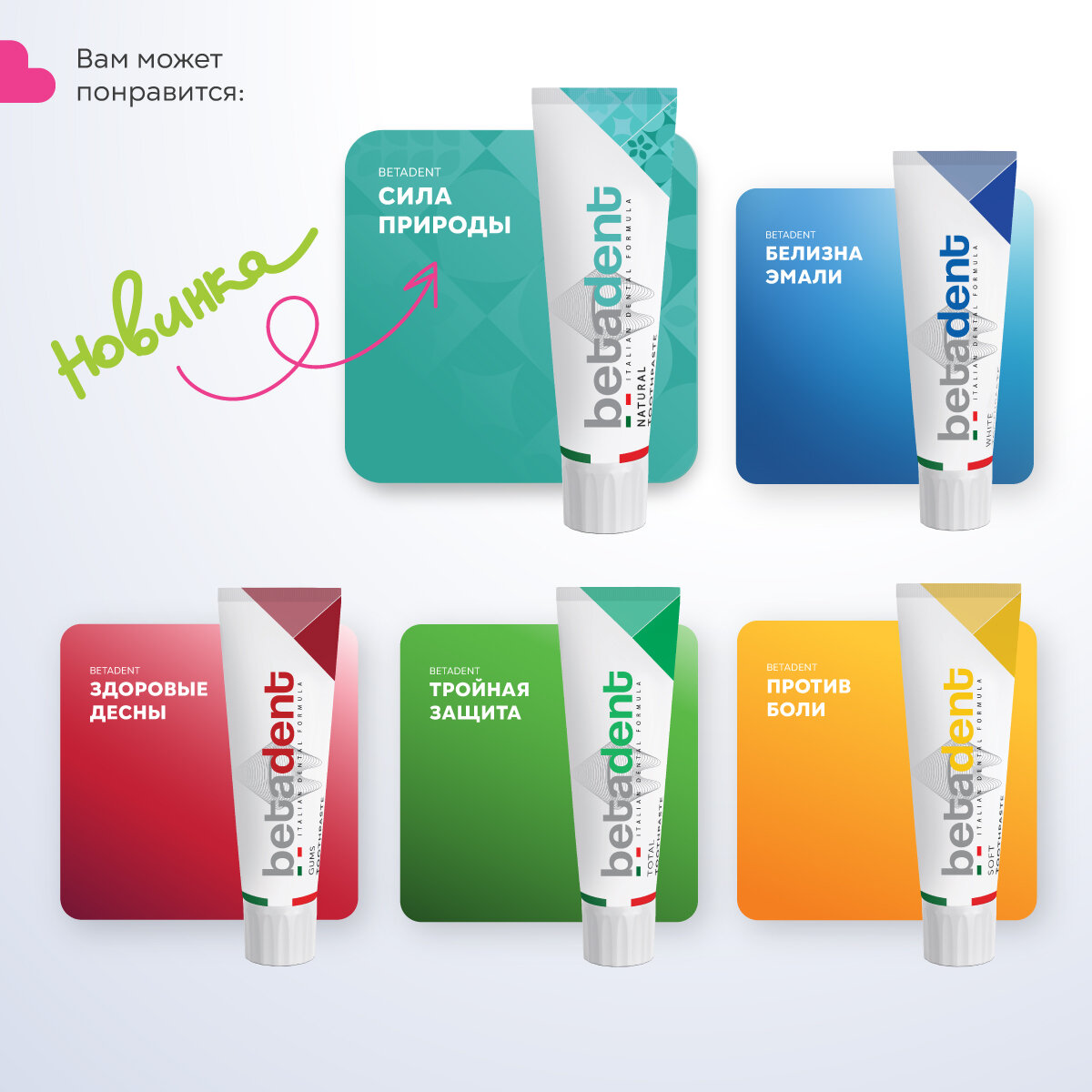 Как получать еще больше комплиментов? Попробовать BETADENT ! Рецепт белоснежной улыбки прост: комбинация микронизированного кремния из средиземноморских раковин и монофторфосфата натрия. Она дает мягкое очищение от налета, придает жемчужное сияние и блеск, а также реминерализует эмаль. Не страшен бокал итальянского вина или чашечка настоящего кофе, ведь BETADENT поможет защитить эмаль от окрашивания. Зубная паста гарантирует свежее и чистое дыхание на весь день. С таким помощником не страшно «расплыться» в улыбке и заговорить с человеком, который скажет: «Вы просто Bellissima! Perfetto!»