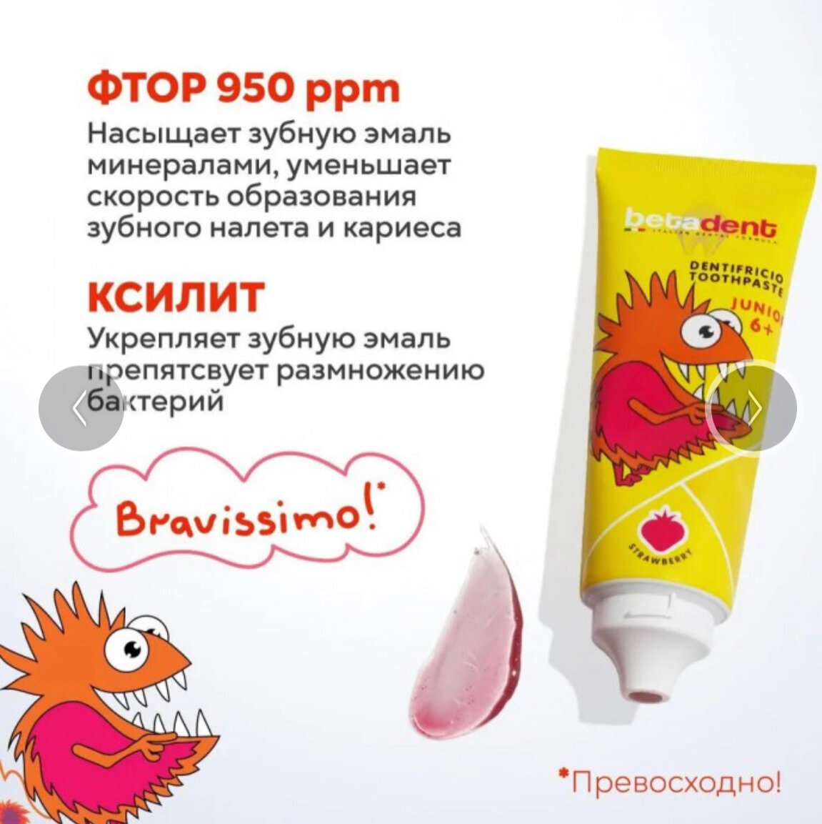 Зубная паста Betadent Junior разработана для укрепления эмали, защиты от кариеса и ежедневного применения для детей от 6 лет.