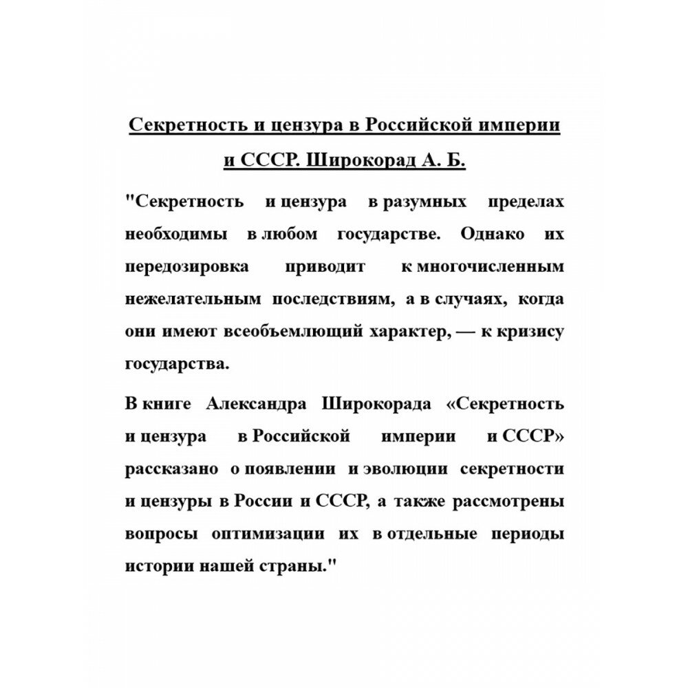 В книге Александра Широкорада "Секретность и цензура в Российской империи и СССР" рассказано о появлении и эволюции секретности и цензуры в России и СССР, а также рассмотрены вопросы оптимизации их в отдельные периоды истории нашей страны.