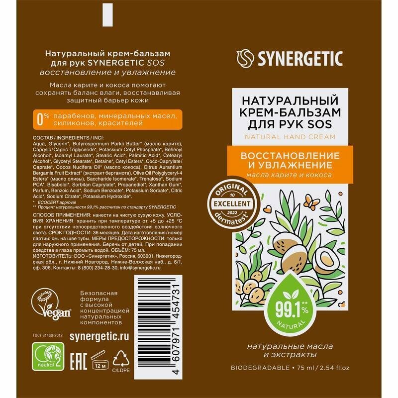 Крем-бальзам для рук Synergetic SOS восстановление и увлажнение 75мл Синергетик