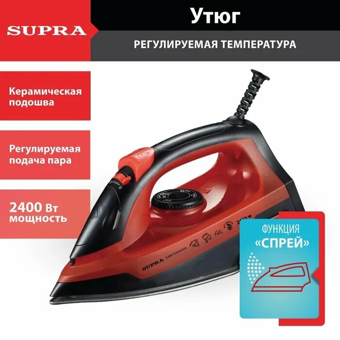 Утюг Supra IS-2421 красный/черный, мощность 2400Вт, подошва утюга керамическая, паровой удар 140г, емкость для воды 160мл