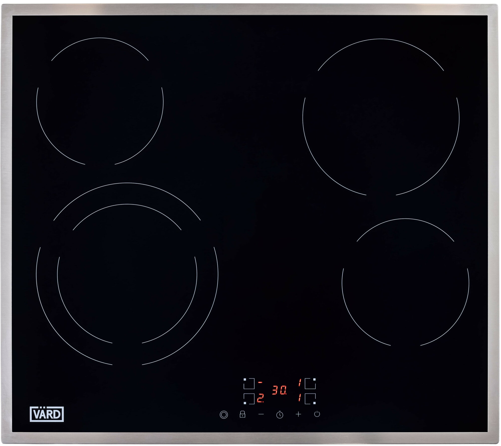 Электрическая варочная панель VARD .Встраиваемая стеклокерамическая электрическая варочная панель черного цвета и рамкой из нержавеющей стали станет стильным и практичным решением для вашей кухни.Благодаря отсутствию регуляторов и кнопок стеклокерамическая поверхность легко и удобно чистится: для этого нужны металлический скребок, специальное средство и совсем немного усилий.Двойная зона расширения может использоваться для приготовления и подогревания пищи в посуде разного диаметра — от 160 до 220 мм.С таймером автоматического отключения вы можете задать время работы каждой из четырёх зон и не беспокоиться о том, что приготавливаемая пища подгорит или переварится.Будильник позволяет запрограммировать подачу звукового сигнала через определённое время без отключения зоны нагрева.Металлическая рамка помогает сохранить идеальный внешний вид стеклокерамической поверхности, защищая края от сколов. Помимо этого, рамка препятствует разливу жидкости по столешнице и визуально сочетается с металлическими деталями оформления кухни.