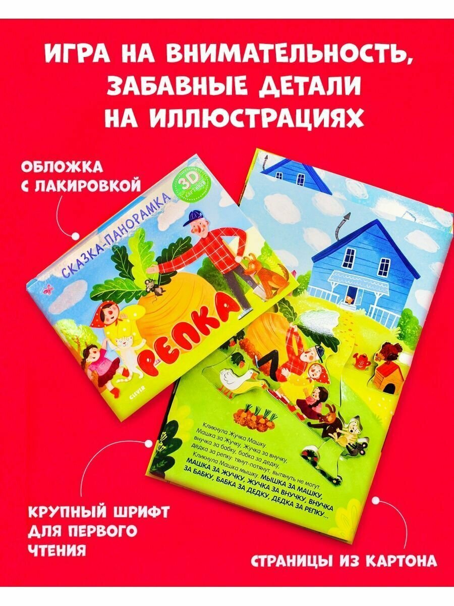 «Репка. Сказка-панорамка» будет радовать вас не один год: страницы сделаны из прочного картона, а объемные элементы надежно закреплены в конструкции. При первом открытии объемные картинки могут раскрываться с небольшим усилием: просто раскройте книгу до конца на каждом развороте пару-тройку раз, и тогда все панорамки встанут на свои места.