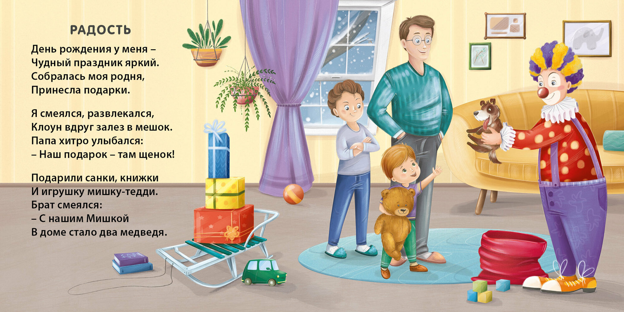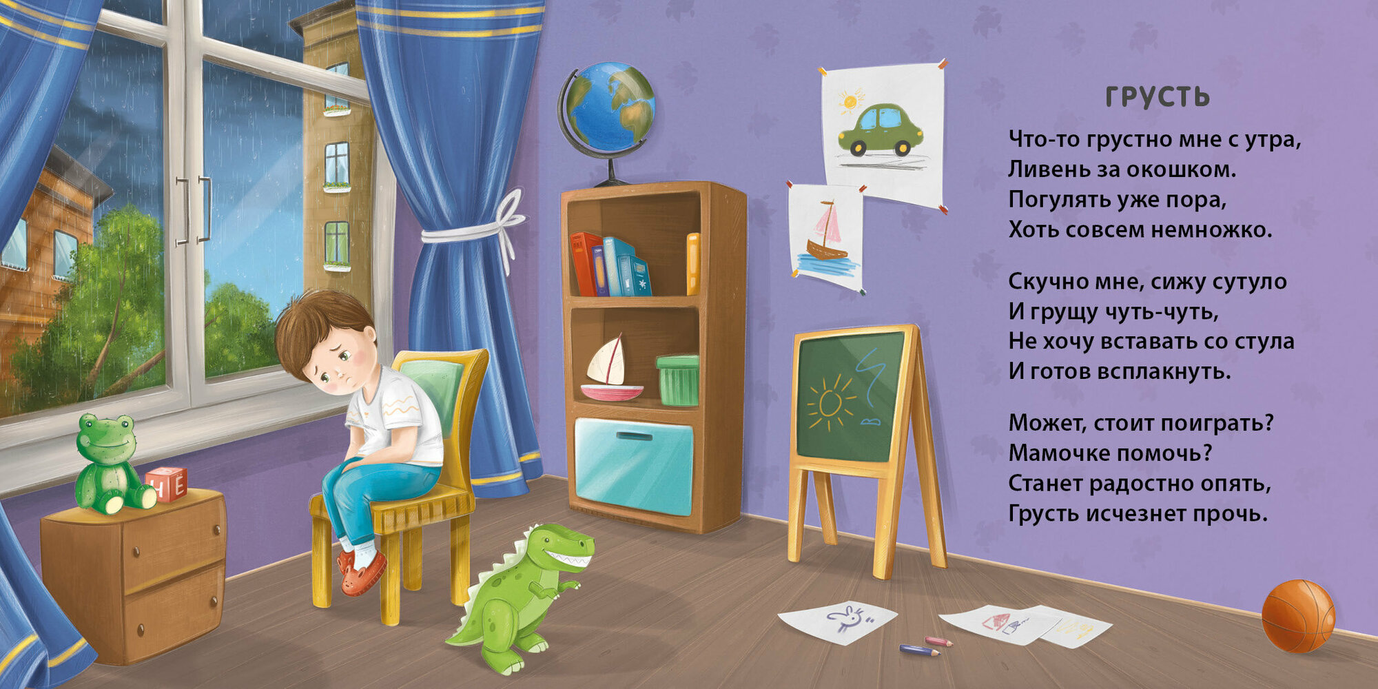 Я бы не взяла такую книгу с целью познакомить ребёнка с эмоциями. Описание для эмоций уж очень хромает. Рифма... Ну ее считай и нет. Художник старался. К каждой ситуации подобрана цветовая гамма, которая, видимо, считается "стандартом" для той или иной эмоции. Но это книгу не спасло. Ребёнок не поймёт, что автор имел ввиду. Текст не цепляет, не запоминается. Он очень скучный и монотонный для всех эмоций. А ведь можно было поиграть с ритмом текста и сделать его живым!