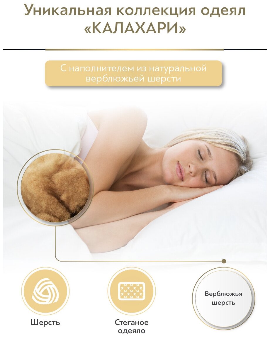 Одеяло 2-спальное Daily by Togas Калахари, 175х200 см имеет состав, верх, 100% хлопок-тик, наполнитель, 60% верблюжья шерсть, 40% полиэфирное волокно. Верблюжья шерсть обладает присущими только ей свойствами. Она прочнее и легче многих видов шерсти, имеет полую структуру, благодаря которой поддерживает постоянную температуру тела. Верблюжья шерсть не только удерживает воздух, но и поглощает влагу, быстро ее испаряет, оставляя тело сухим. Шерстяной наполнитель не электризуется и имеет свойство снимать статическое напряжение. Уход, может применяться машинная стирка при температуре не выше 30 градусах. Не отбеливать. Не гладить. Сушить при низких температурах.