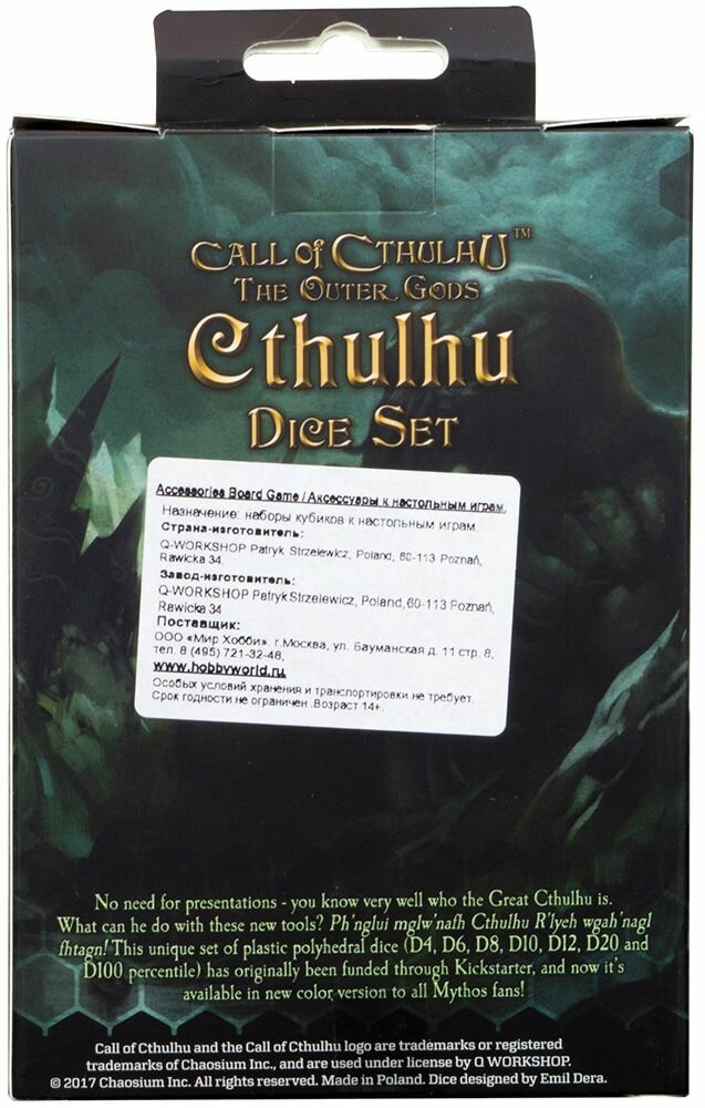 На сегодняшний день товар «Набор кубиков Call of Cthulhu 7 шт. The Outer Gods Cthulhu Q-Workshop (SCTC60)» можно купить с кешбеком в 1 магазине: Яндекс.Маркет