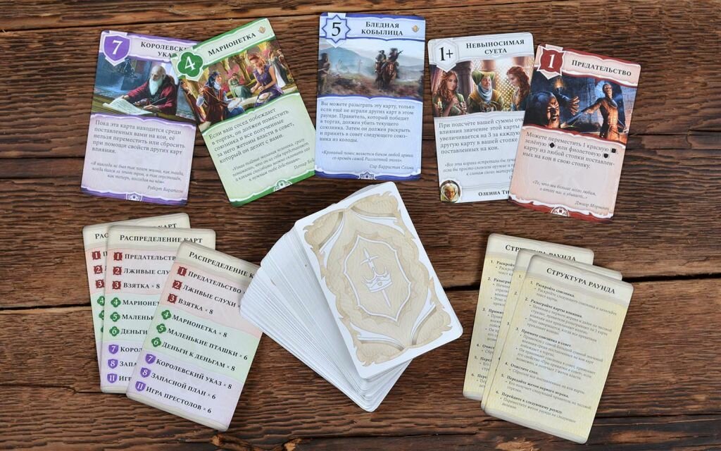 Как играть?Все игроки начинают партию с 10 картами влияния на руках. С их помощью вы будете воздействовать на оппонентов и принимать союзников в советы. Каждый игрок обладает двумя советами: причём один из них делит с игроком слева, а другой – с игроком справа. Непосредственно совет состоит из различных карт союзников, каждая из которых обладает определённым показателем власти – и тот совет, в котором у вас суммарная власть меньше, считается вашим малым советом. Это важно иметь в виду – потому как в конце игры победит игрок, обладающий самым сильным малым советом!