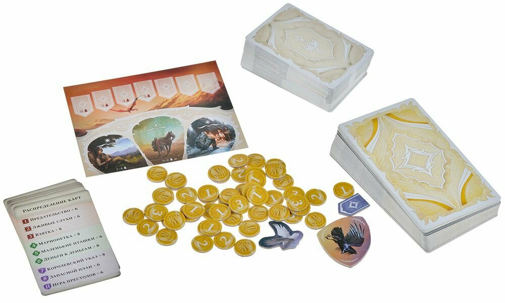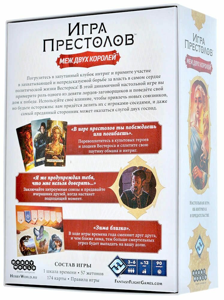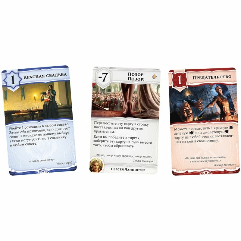 Особенности игрыКогда вы освоитесь с базовыми правилами, вы сможете усложнить игровой процесс и добавить ещё больше простора для тактик и хитростей. К примеру, добавив уникальные карты влияния, вы можете расширить ассиметричный аспект игры. Каждый игрок получит 4 особые карты, отражающие способности конкретного правителя, за которого он играет! Поклонники "Песни льда и огня" оценят погружение в атмосферу Вестероса.