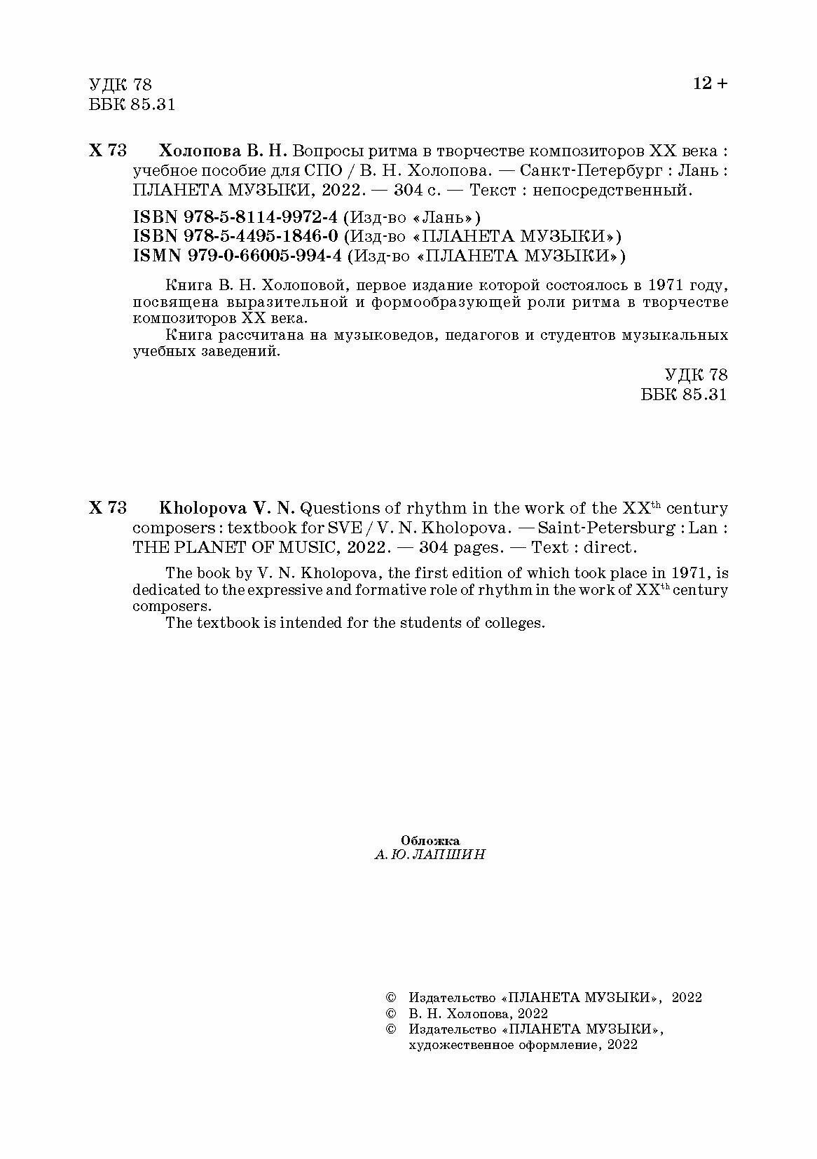 Вопросы ритма в творчестве композиторов XX века. Учебное пособие (Холопова Валентина Николаевна); Планета Музыки, 2022