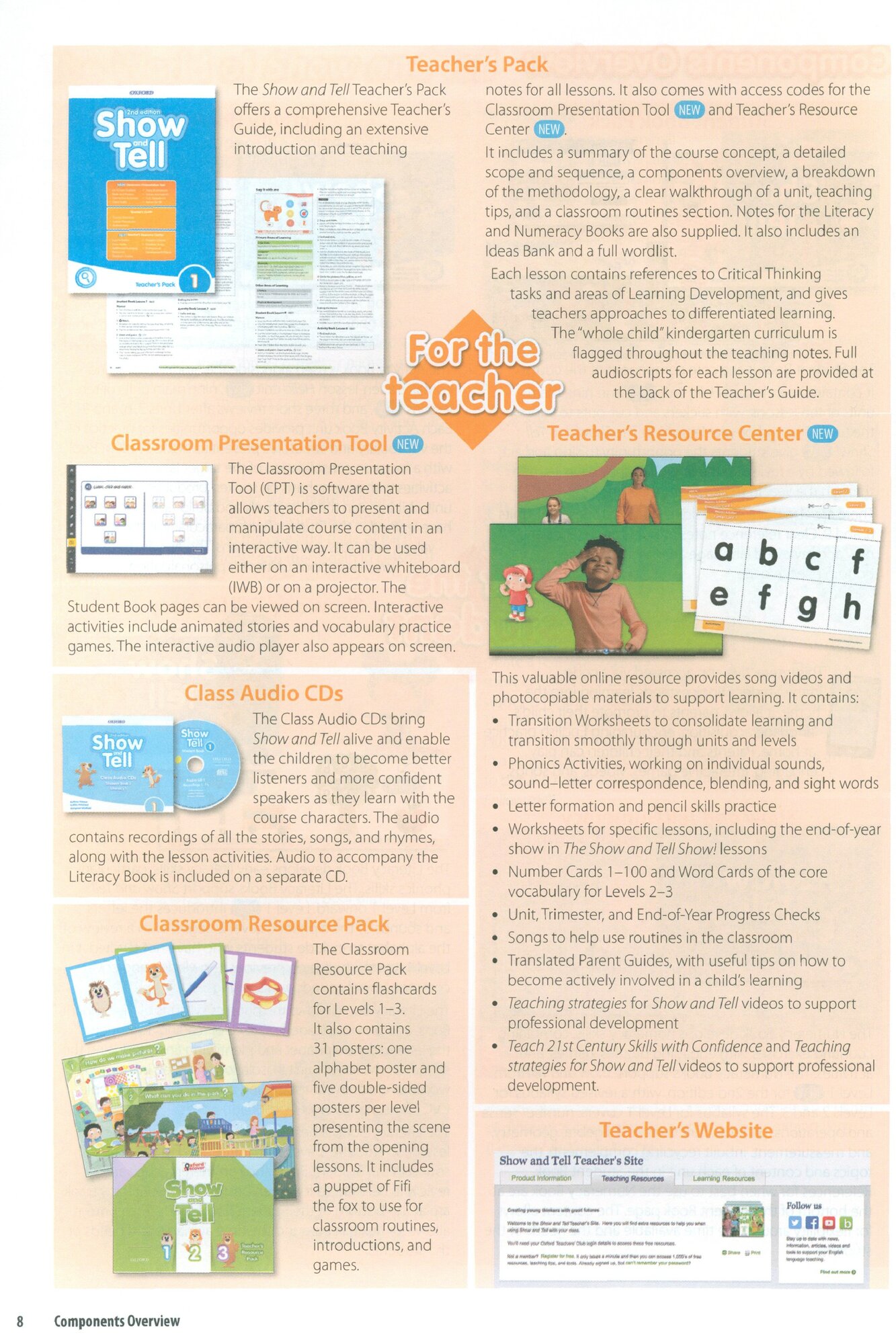 Комплект для учителя Show and Tell содержит необходимую информацию об уроках и дополнительные ресурсы, которые учителя могут использовать в классе. Также комплект содержит коды доступа к инструменту презентации в классе и ресурсному центру для учителей и исчерпывающее руководство для учителя, включающее обширные учебные заметки.