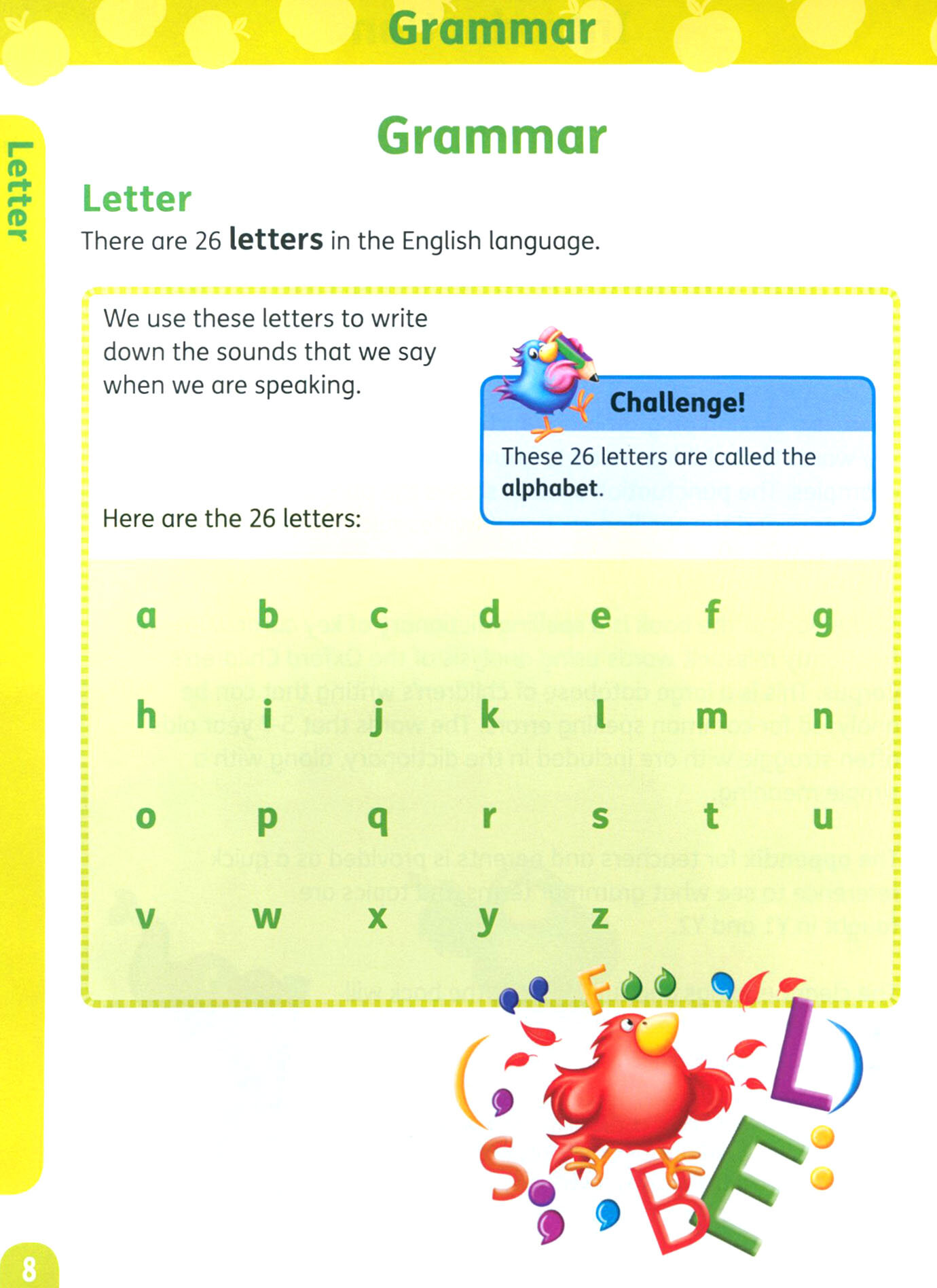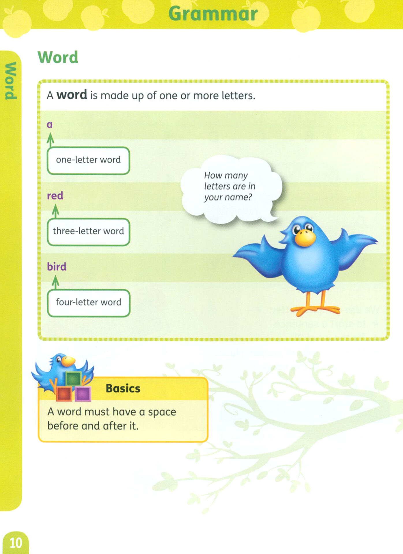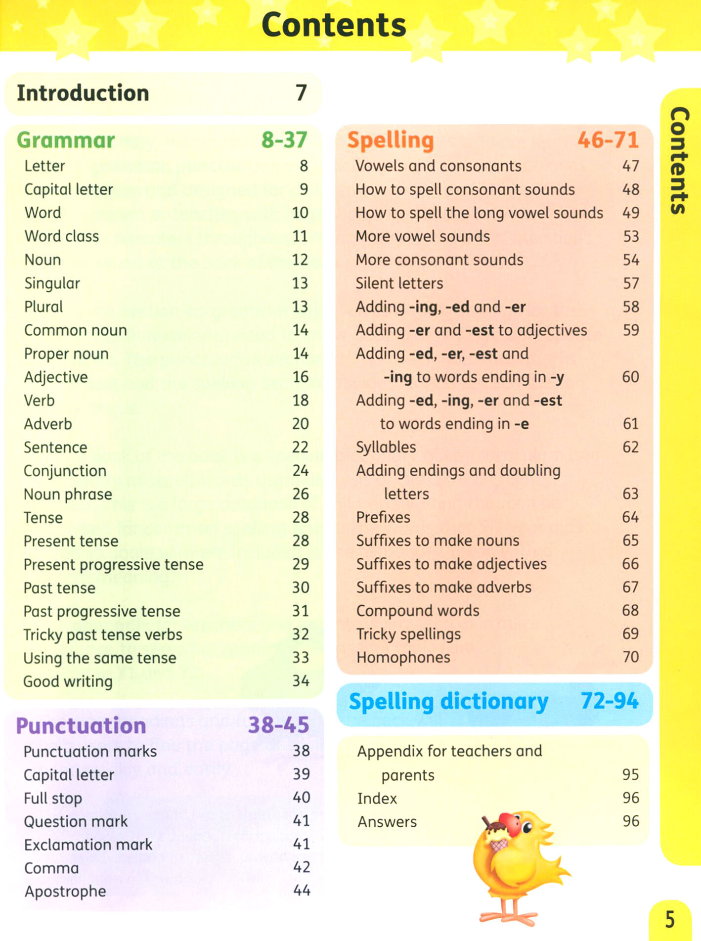 Clearly-presented and age-appropriate explanations of grammar terms, punctuation, and spelling will support young learners grasp the concepts