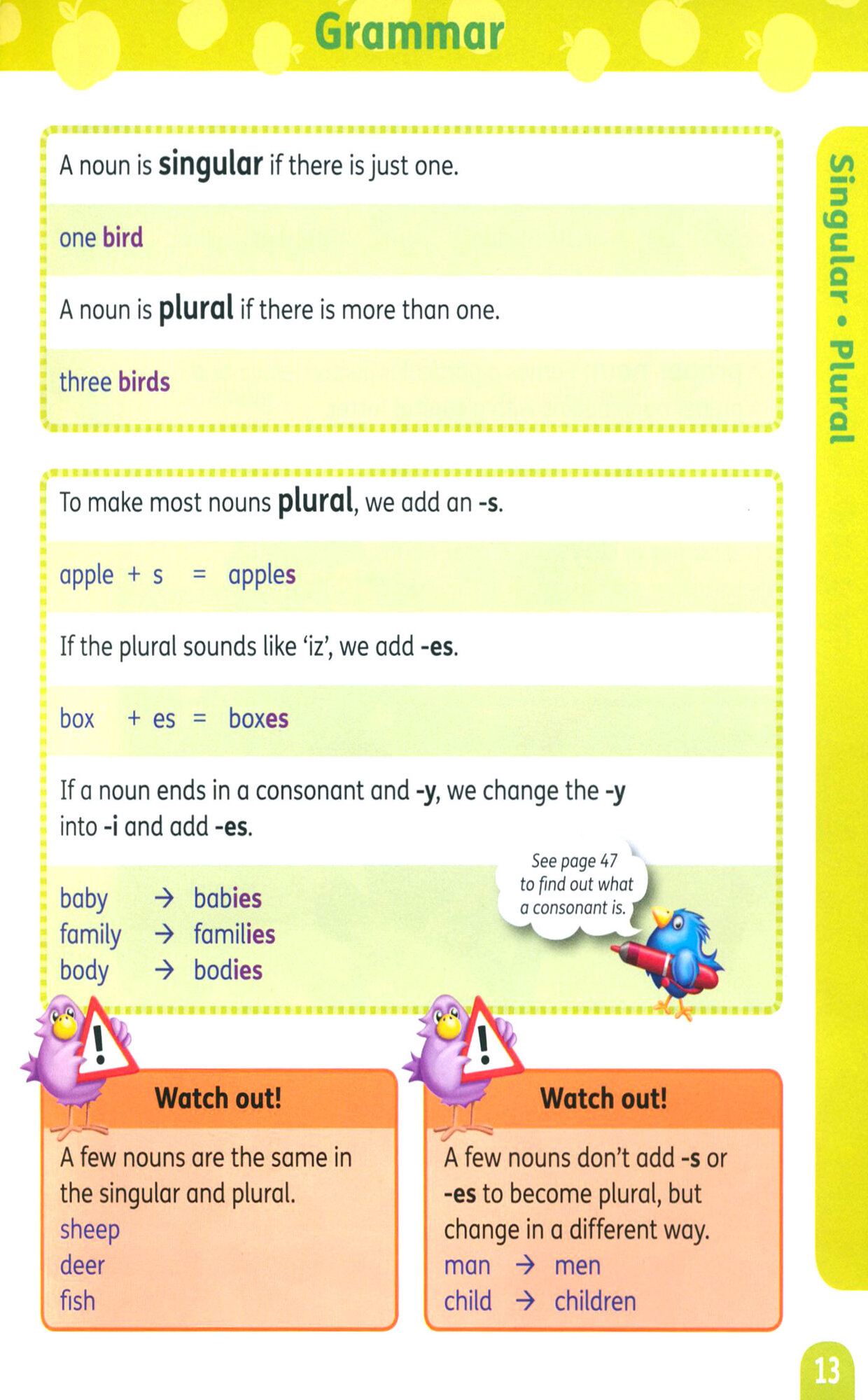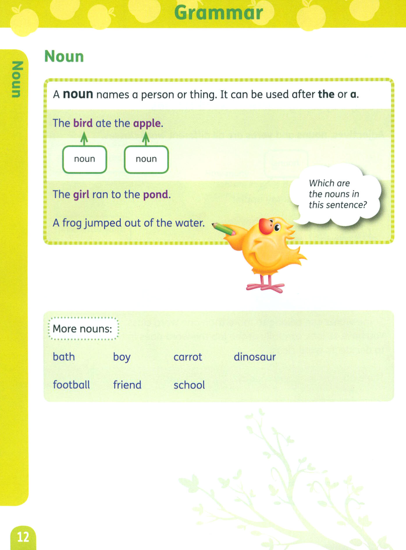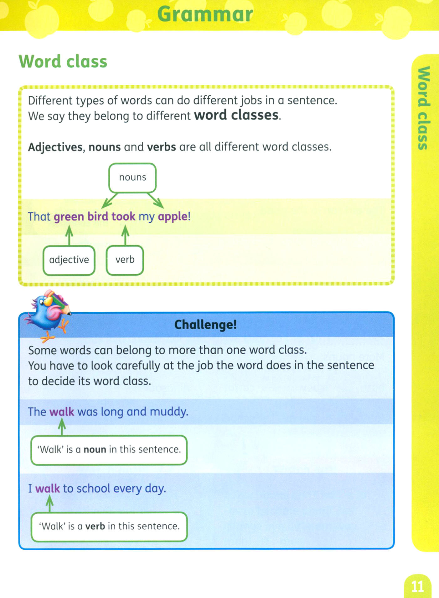 Clearly-presented and age-appropriate explanations of grammar terms, punctuation, and spelling will support young learners grasp the concepts