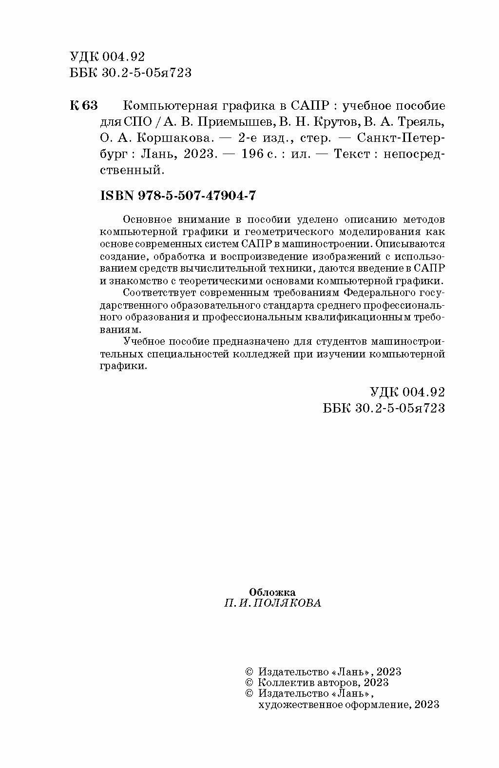 Компьютерная графика в САПР. Учебное пособие для СПО (Приемышев Александр Владимирович, Крутов Владимир Николаевич, Треяль Вячеслав Августович); Лань, 2023