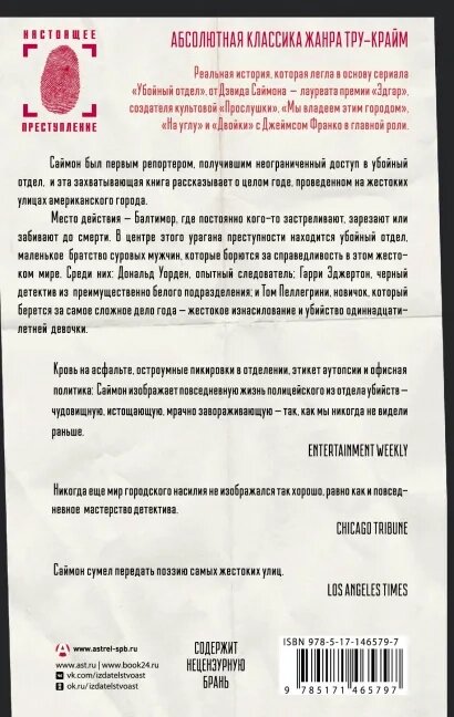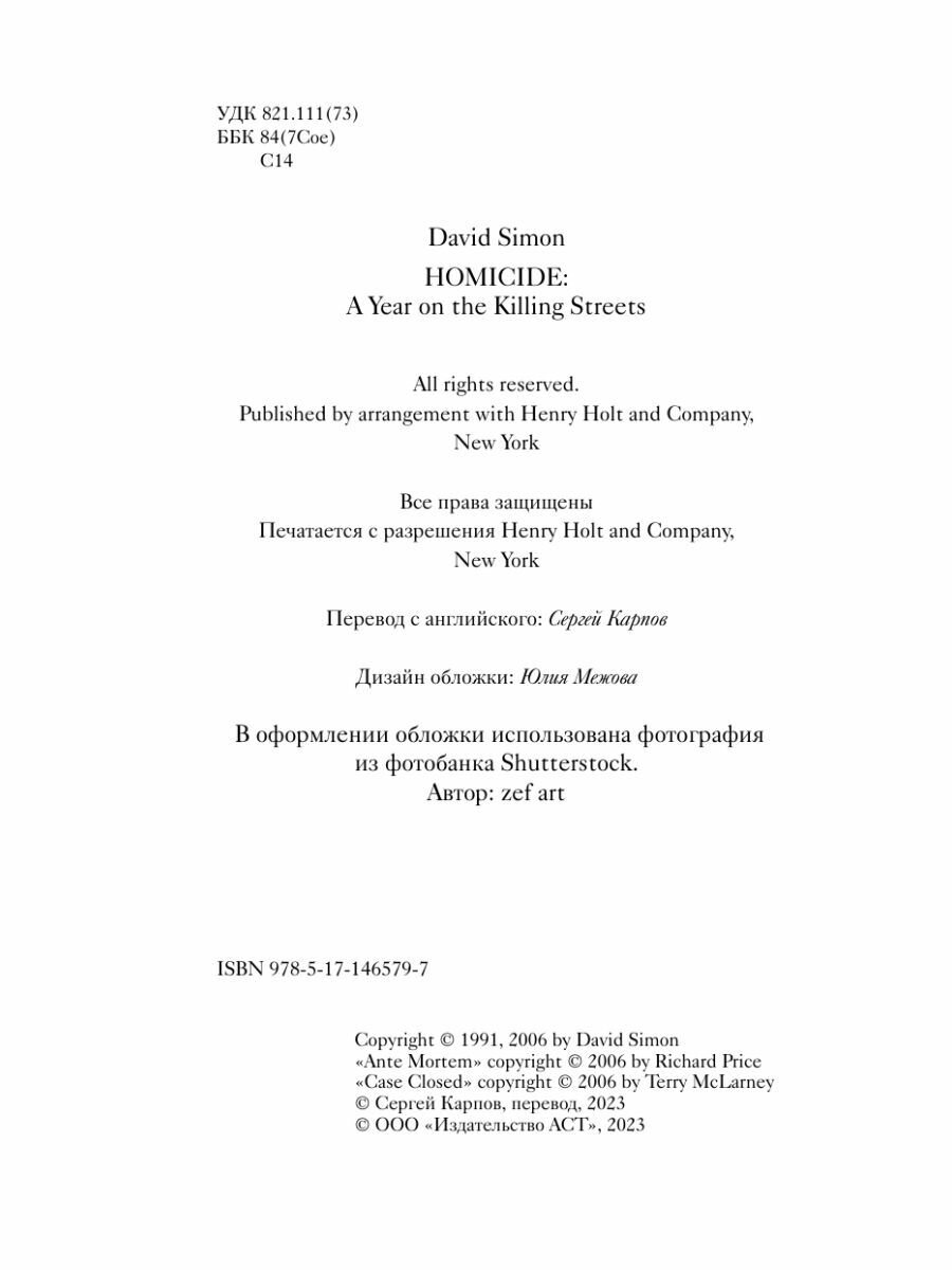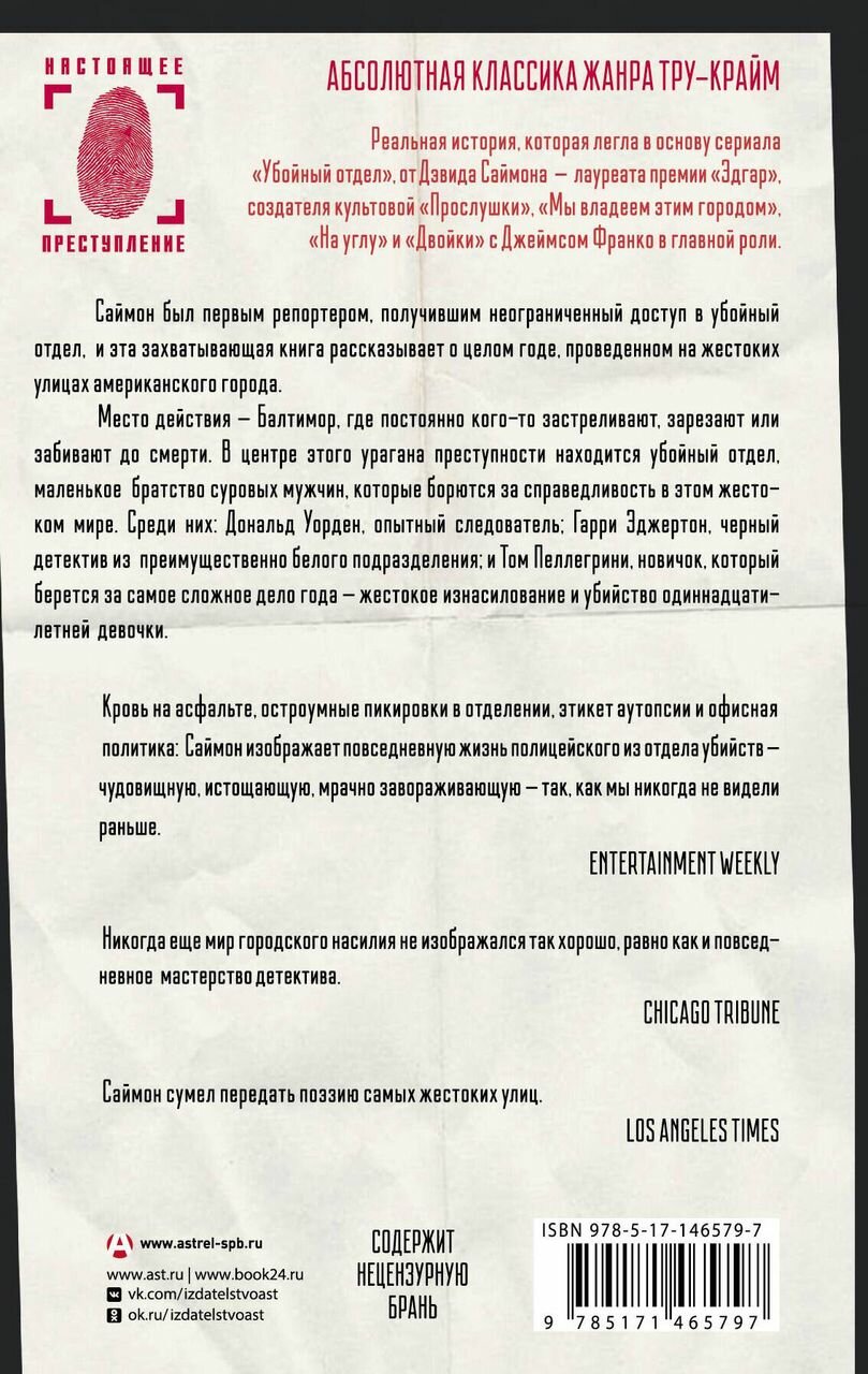 Книга американского криминального журналиста на английском была выпущена уже давно - в 1991 году, и вот наконец-то её перевели на русский. Главное достоинство работы - история от первого лица, поскольку Д.Саймон целый год находился в компании полицейских детективов, расследовавших кровавые преступления. 90-ые были лихими и в США, о чём можно смело удостовериться, прочитав данный труд.