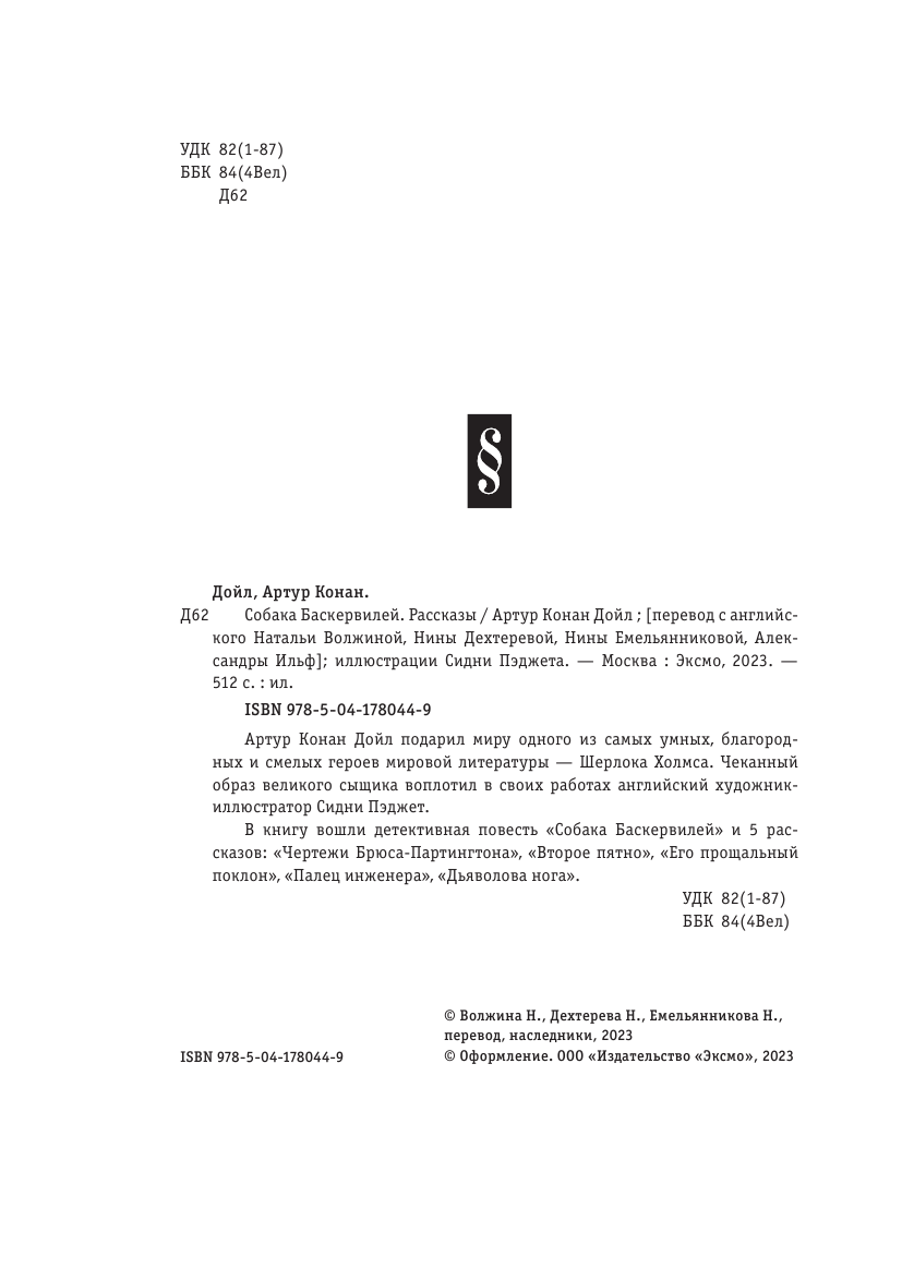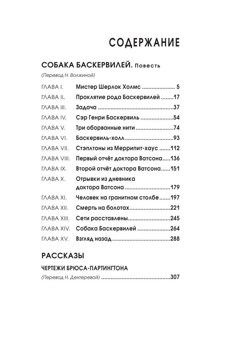 В книгу вошли детективная повесть "Собака Баскервилей" и 5 рассказов: "Чертежи Брюса-Партингтона", "Второе пятно", "Его прощальный поклон", "Палец инженера", "Дьяволова нога".