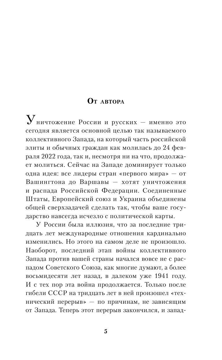 "Западный мир давно ведет против России войну, стремясь уничтожить ее цивилизацию и культуру. Сейчас это противостояние перешло на новый уровень и русские объявлены вне закона. Уничтожение России и русских - именно такая цель стоит перед коллективным Западом…"