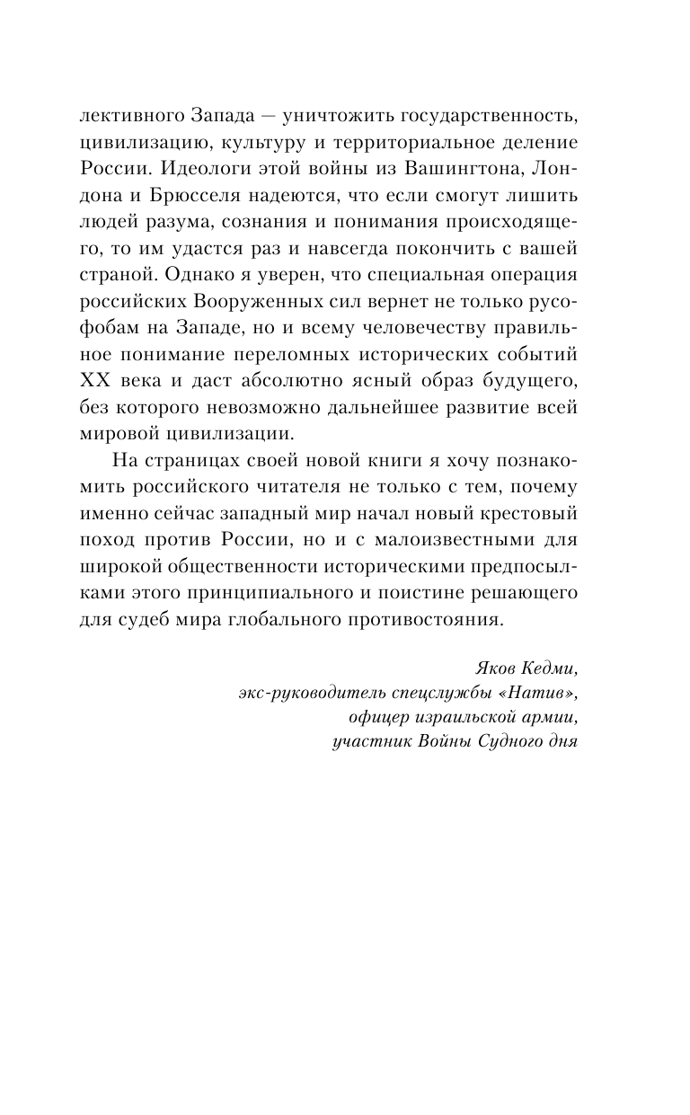 Новая книга известного военно-политического эксперта, бывшего руководителя израильской спецслужбы "Натив" Якова Кедми посвящена войне на уничтожение, которую коллективный Запад развязал против России.