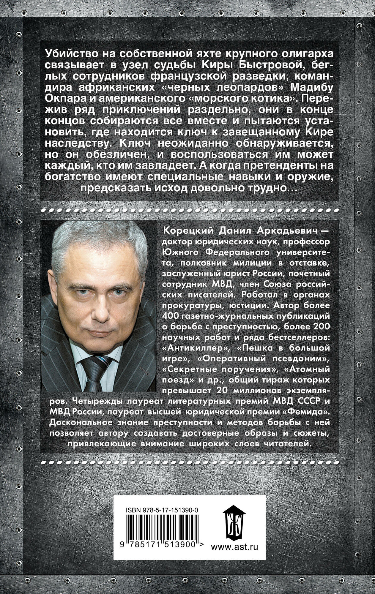 Убийство на собственной яхте крупного олигарха связывает в узел судьбы Киры Быстровой, беглых сотрудников французской разведки, командира африканских "чёрных леопардов" Мадибу Окпара и американского "морского котика". Пережив ряд приключений раздельно, они в конце концов собираются все вместе и пытаются установить, где находится ключ к завещанному Кире наследству. Ключ неожиданно обнаруживается, но он обезличен, и воспользоваться им может каждый, кто им завладеет. А когда претенденты на богатство имеют специальные навыки и оружие, предсказать исход довольно трудно…