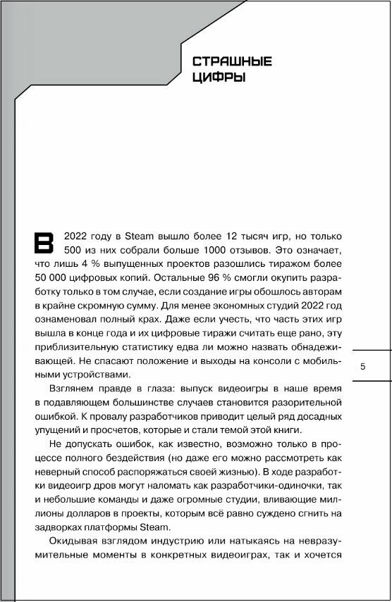 Провал ужасное явление для любого деятеля искусства, а игры как раз искусством и являются. Кому-нибудь покажется, что книга говорит об очевидных вещах, но, как по мне, она справляется со своей задачей — снимает розовые очки с начинающих разработчиков. Какой бы гениальный сюжет ни был заложен в игру, какой бы ни была талантливой команда разработчиков - всегда есть шанс остаться без должной славы и внимания. Книга простым языком раскладывает по полочкам известные факты о провалах ААА-проектов. Показывает какими хитами становились недоделанные проекты инди-студий. Всё честно и без прикрас. Книга глубокая, открывает интересные моменты, на которые стоит обратить внимание при продвижении в публикации игр.