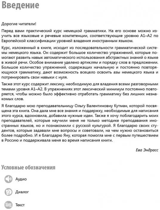 Учебник удобен в использовании: выполнять упражнения можно прямо в книге, в конце пособия даны ключи для самопроверки. К разделу фонетики добавлена аудиозапись, которая поможет привыкнуть к правильному звучанию немецкой речи и поработать над произношением. Текст читает автор учебника, преподаватель с большим стажем и носительница немецкого языка Ева Эндрасс.