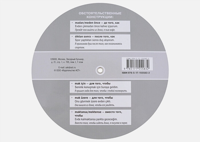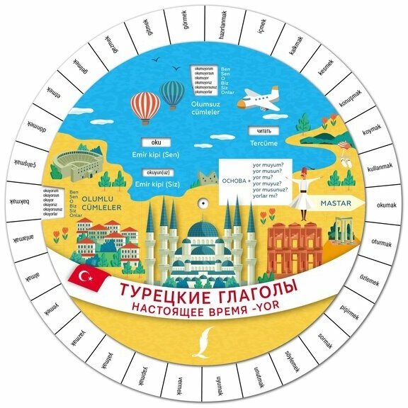 Диск-вертушка "Турецкие глаголы. Настоящее время -yor" — компактный помощник в изучении турецкого языка! С данным наглядным пособием вы легко и быстро выучите 30 основных глаголов турецкого языка и то, как они видоизменяются в зависимости от формы предложения, а также узнаете перевод и формы повелительного наклонения на "ты" и на "Вы".