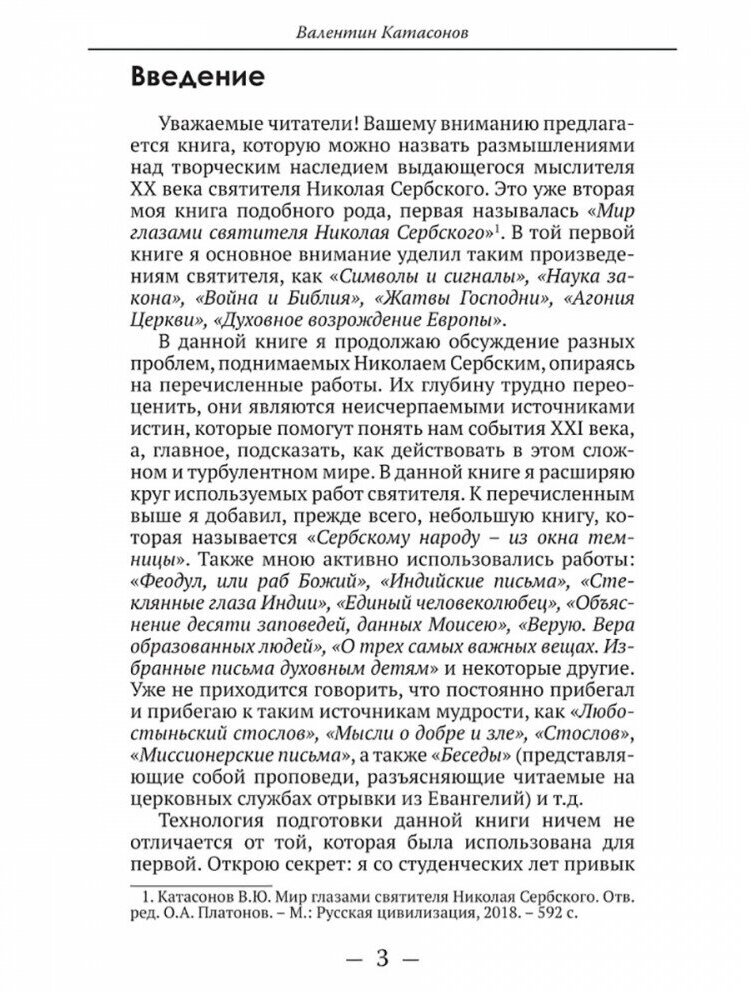 Имя Николая Сербского (Велимировича) сейчас известно многим людям как в Сербии, так и во всем мире. После распада Югославии и снятия запрета на его творчество интерес к личности святителя неуклонно растет, а в 2003 году он был канонизирован Сербской православной церковью. Будучи блестяще образованным человеком и обладая даром писателя, он оставил после себя богатое богословское и литературное наследие. Но пока далеко не все работы Николая Сербского переведены на русский язык. Особенная ценность мировоззрения святителя в том, что оно возвращает современного человека к основам духовного существования, не "отравленного" теориями материалистической философии, рационалистического естествознания и т. д. Данный сборник представляет собой конспекты-комментарии В.Ю. Катасонова к таким работам Николая Сербского, как "Сербскому народу — из окна темницы" "Феодул, или раб Божий", "Индийские письма", "Стеклянные глаза Индии", "Единый человеко-любец", "Объяснение десяти заповедей, данных Моисею", "Верую. Вера образованных людей", "О трех самых важных вещах. Избранные письма духовным детям" и др. Это неисчерпаемые источники вечных истин, которые помогут читателю разобраться в противоречивых событиях XXI века.