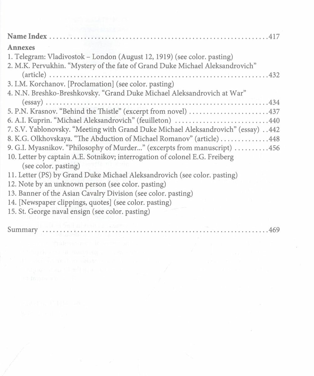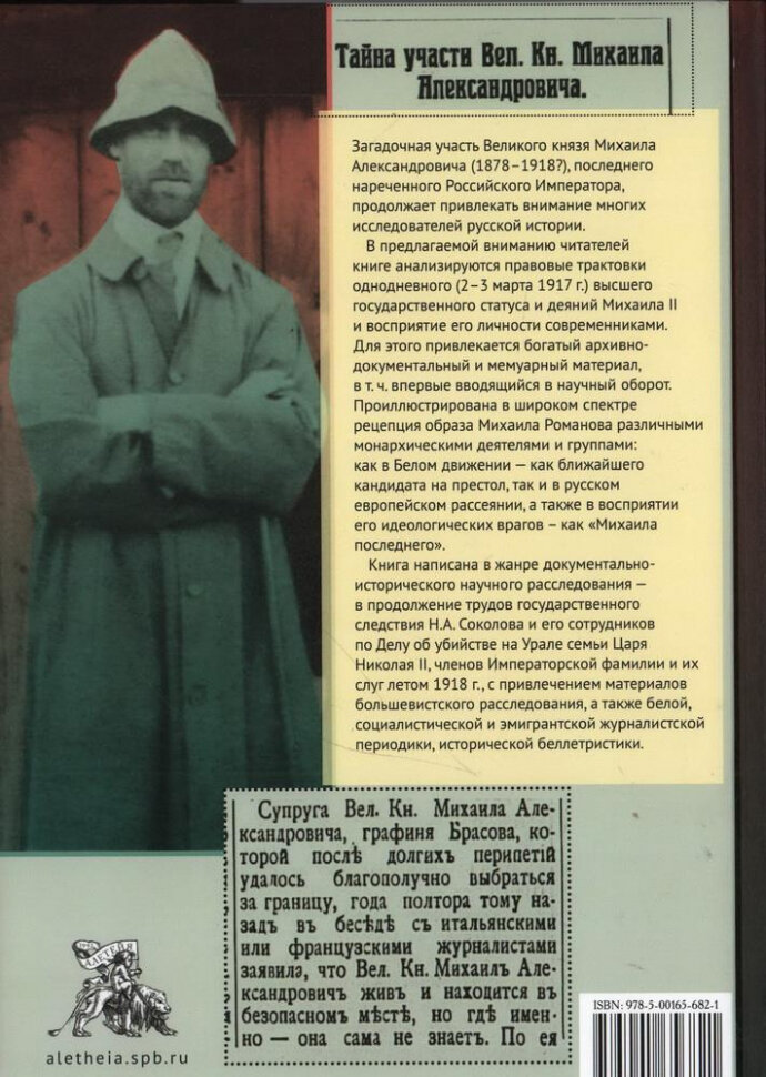 Загадочная участь Великого князя Михаила Александровича (1878-1918?), последнего нареченного Российского Императора, продолжает привлекать внимание многих исследователей русской истории. В предлагаемой вниманию читателей книге анализируются правовые трактовки однодневного (2-3 марта 1917 г. ) высшего государственного статуса и деяний Михаила II и восприятие его личности современниками, для этого привлекается богатый архивно-доку- ментальный и мемуарный материал, в т. Ч. Впервые вводящийся в научный оборот. Проиллюстрирована в широком спектре рецепция образа Михаила Романова различными монархическими деятелями и группами: как в Белом движении — как ближайшего кандидата на престол, так и в русском европейском рассеянии, а также в восприятии его идеологических врагов — как "Михаила последнего". Книга написана в жанре документально-исторического научного расследования — в продолжение трудов государственного следствия Н. А. Соколова и его сотрудников по Делу об убийстве на Урале семьи Царя Николая II, членов Императорской фамилии и их слуг летом 1918 г., с привлечением материалов большевистского расследования, а также белой, социалистической и эмигрантской журналистской периодики, исторической беллетристики.