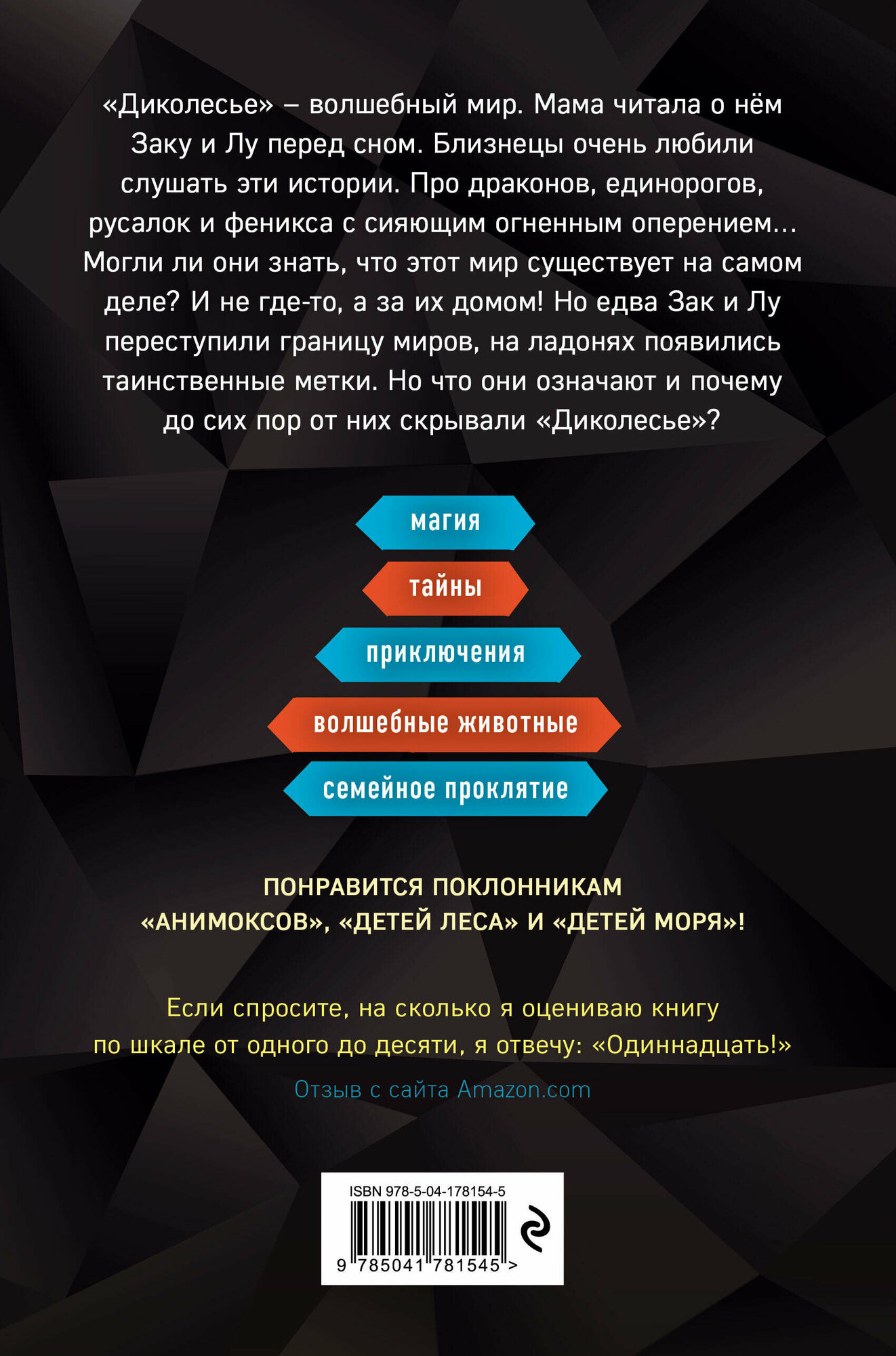 "Диколесье" - волшебный мир. Мама читала о нём Заку и Лу перед сном. Близнецы очень любили слушать эти истории. Про драконов, единорогов, русалок и феникса с сияющим огненным оперением… Могли ли они знать, что этот мир существует на самом деле? И не где-то, а за их домом! Но едва Зак и Лу переступили границу миров, на ладонях появились таинственные метки. Но что они означают и почему до сих пор от них скрывали "Диколесье"?