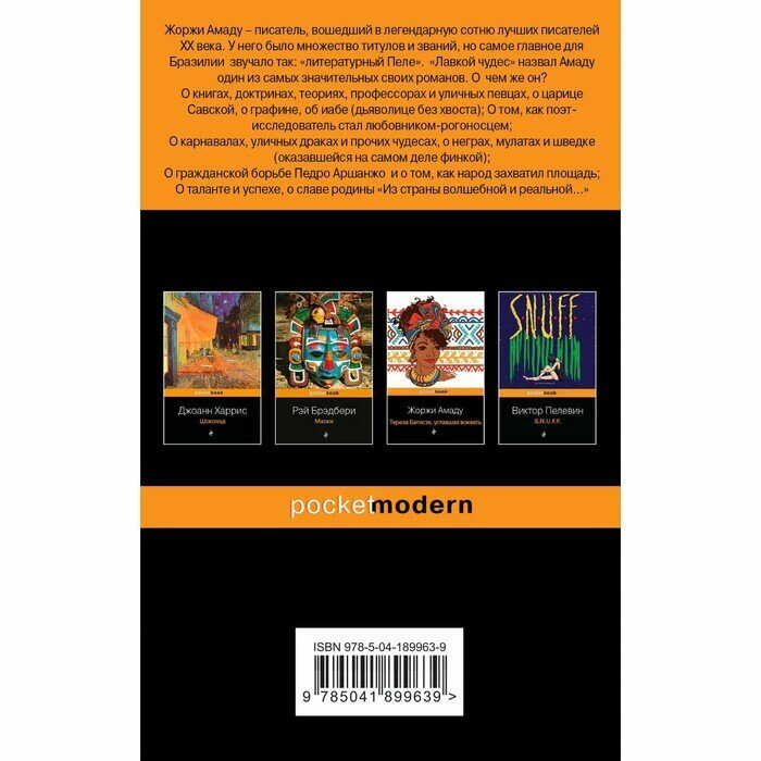Два романа из солнечной Бразилии от "литературного Пеле" ( комплект из 2-х книг: "Тереза Батиста, уставшая воевать" и "Лавка чудес" Жоржи Амаду)"Лавкой чудес" назвал Амаду один из самых значительных своих романов, "лавкой чудес" была и вся его жизнь. Роман написан в жанре магического реализма, и появился он раньше самого известного произведения в этом жанре - "Сто лет одиночества" Габриэля Гарсиа Маркеса.История Терезы Батисты — очень трагичная и печальная. Вместо радостей детских лет — унижение и насилие.История Терезы Батисты — история мужественной женщины, с невероятной силой воли и с золотым сердцем, готовым прийти на помощь.История Терезы Батисты — история любви, ведь она была рождена для любви. Несмотря на все беды, которые выпали ей в жизни, она сохранила веру в любовь. "В ее улыбке рассвет и солнце".Вот она, бразильская душа — жизнелюбивая, веселая, приветливая и стойкая.