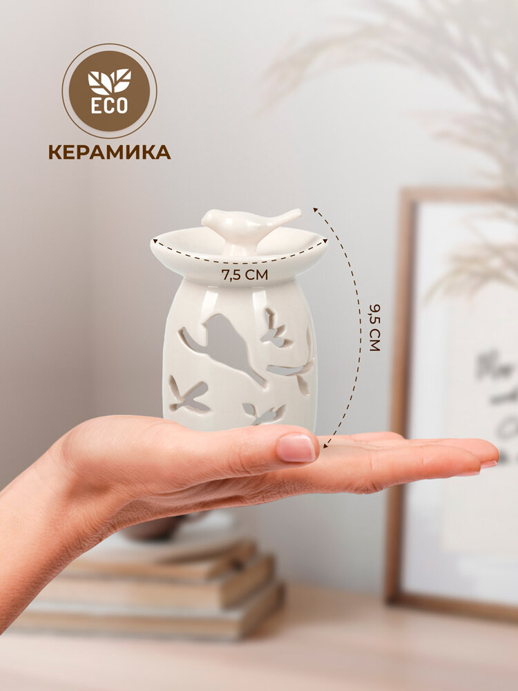 ---Технические характеристики: Предназначение: Для использования в бане, сауне, дома. Размер: 7,5 x 7,5 x 9,5 см. Цвет - слоновая кость, глянец.Материал: Доломит.Срок годности: Не ограничен.---Аромалампа - это быстрый и удобный способ создать в помещении притягательную атмосферу и получить наслаждение от изысканных благовоний. Аромалампы применяются дома и на работе, в бане и сауне. Ароматы помогут вам поднять настроение или расслабиться после тяжелого рабочего дня, а в период простудных заболеваний эфирные масла помогут очистить воздух помещения от вредоносных вирусов и болезнетворных микробов. Ароматерапия увеличивает оздоровительный эффект массажа, бани или сауны, кроме того благоприятно взаимодействует с косметическими процедурами. Каменные лампы производятся вручную. Камень дольше удерживает тепло, поэтому и эффект от использования такой аромалампы более действенный. Таким образом, к благоприятному эффекту аромалампы добавляется энергетика камня. С помощью аромалампы можно отлично оформить интерьер и создать тонкий и чарующий аромат эфирных масел, а мягкий свет аромалампы послужит приятным дополнением для романтического свидания.Способ применения: Пользоваться аромалампой очень просто - в небольшую емкость сверху наливают воду почти до краёв, затем в эту воду капают 2-3 капли чистого 100% эфирного масла, а в грот аромалампы ставят свечу, которая нагревает ароматический состав.